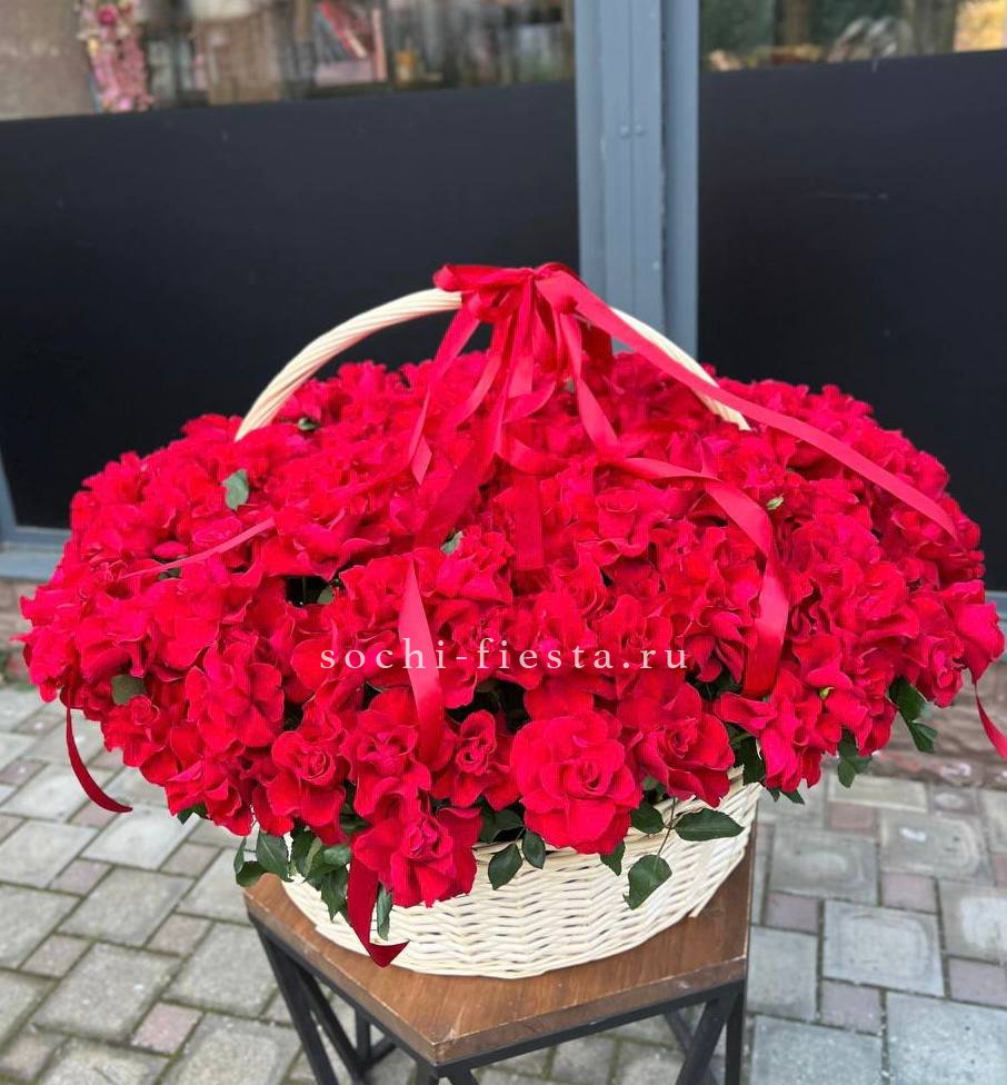 Двести одна роза глубокого красного оттенка собрана в просторной корзине. Плотное заполнение создает цельную бархатистую поверхность, где каждый бутон дополняет соседний. Масштабная композиция для выражения самых сильных чувств.