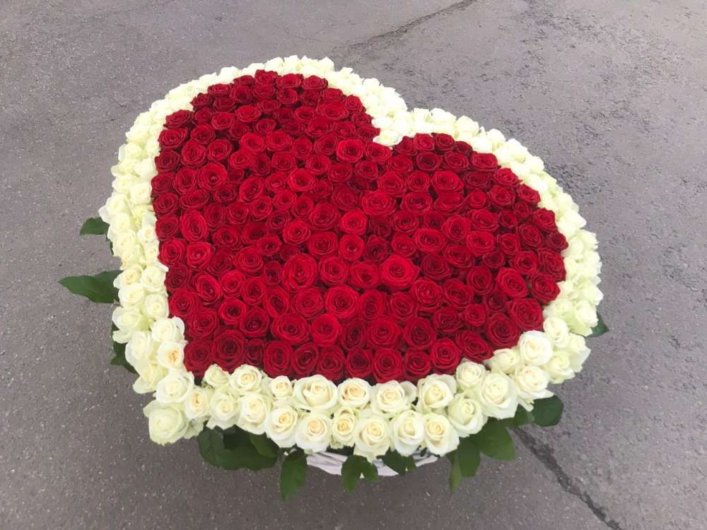 Триста тридцать три розы уложены в корзину и образуют плотную цветочную поверхность. Объём композиции притягивает внимание и создаёт ощущение праздничного изобилия.