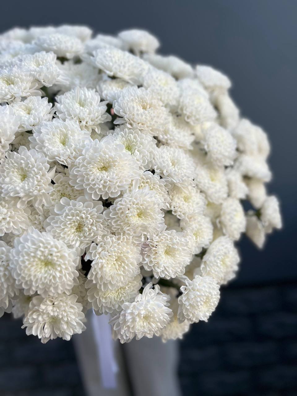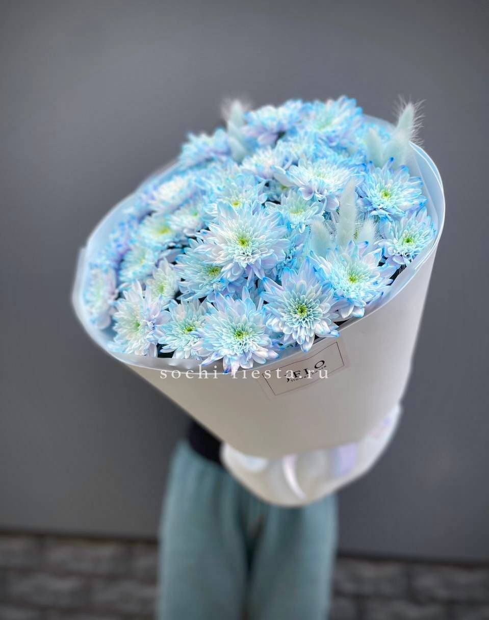 Белоснежные шапки кустовой хризантемы собраны в пышный монобукет, который наполняет пространство свежестью и создает праздничное настроение на любом событии.