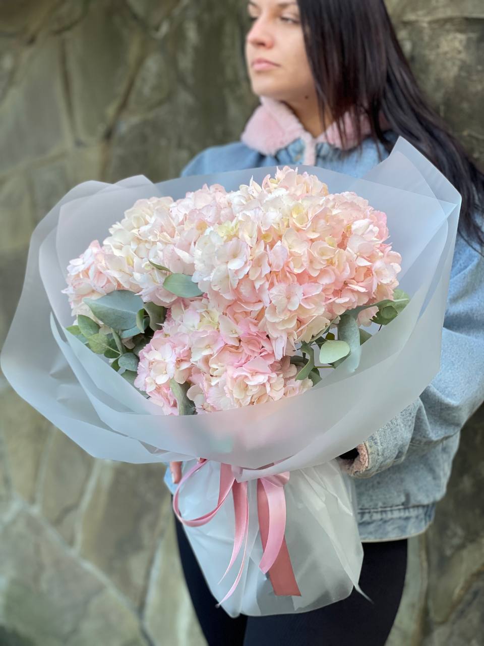 Пять пышных соцветий гортензии собраны в плотный букет с ветками эвкалипта. Розовый оттенок лепестков создаёт мягкое облако цвета, а зелень добавляет свежести композиции. Такой формат хорош для интерьера в светлых тонах.