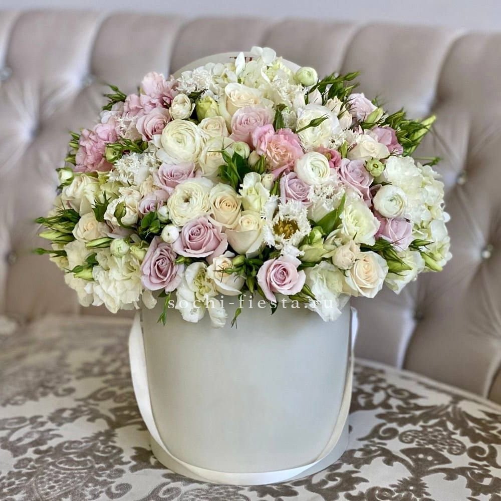Пышная композиция объединяет крупные соцветия гортензии с бархатными розами и воздушной эустомой. Мисти бабблс и диантус создают мягкую дымку вокруг центральных бутонов. Веточки эвкалипта добавляют свежести и завершают образ.