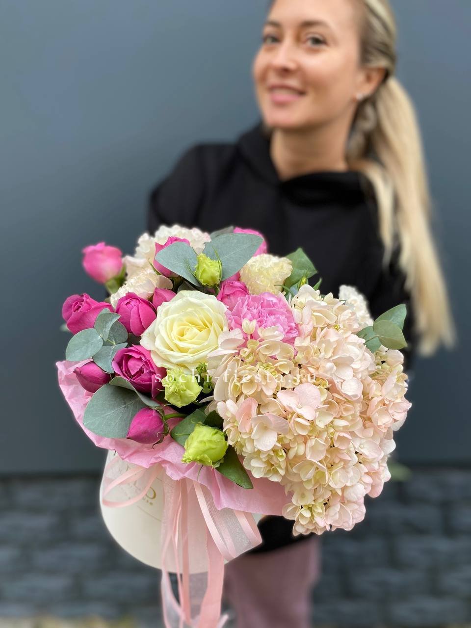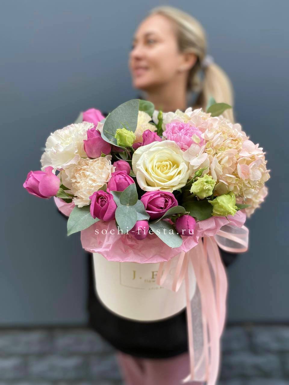 Сочетание пышной голубой гортензии и классических белых роз — это гимн нежности и чистоты. Букет, который не просто удивляет своим масштабом, но и дарит ощущение безмятежности. Идеальный выбор для самого искреннего признания.