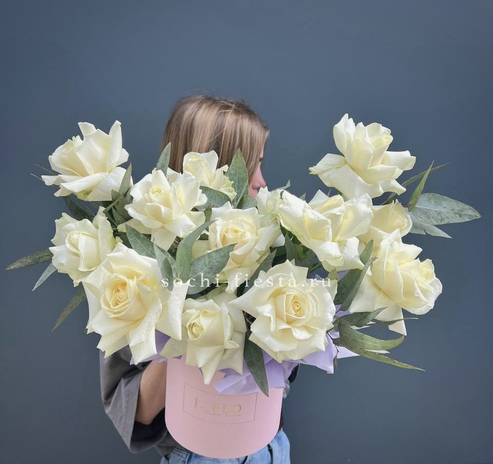 Пышная гортензия соседствует с крупными бутонами роз и многослойной эустомой. Веточки эвкалипта придают свежесть всей композиции. Букет с выразительным объемом и природной гармонией форм.