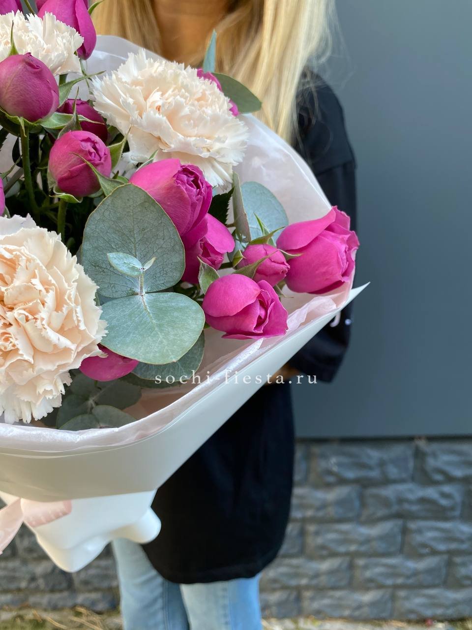 Воздушные кисти мисти бабблс переплетаются с яркими диантусами создавая объёмную текстуру. Эвкалипт добавляет свежести и завершает композицию лёгкими зелёными нотами.