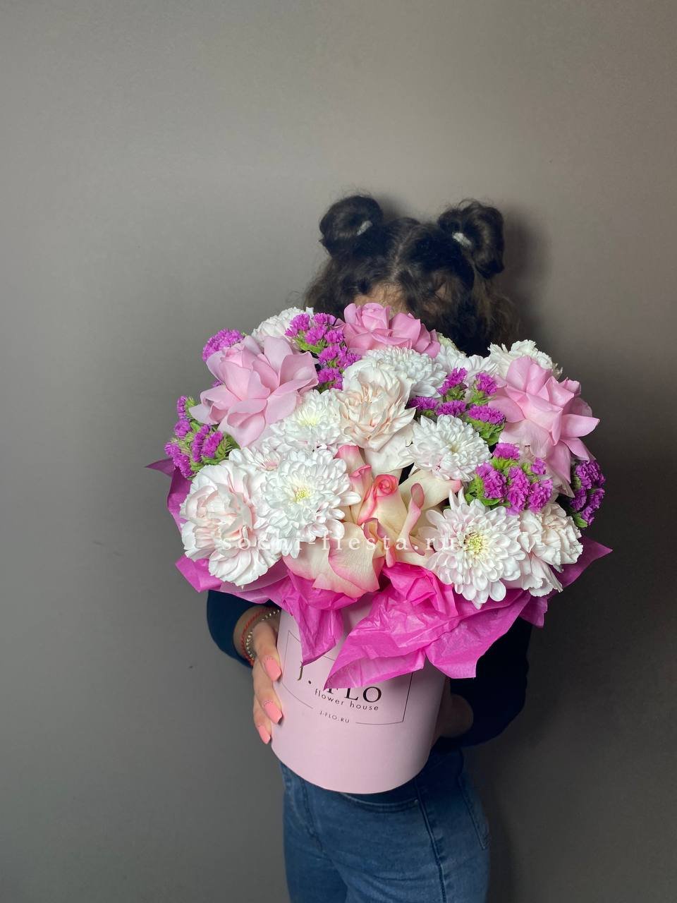Розовые оттенки роз и эустомы переплетаются с яркой хризантемой в теплой композиции. Хлопок добавляет текстурной мягкости, а озотамус создает ажурную основу. Букет дарит радостное настроение и естественную красоту.
