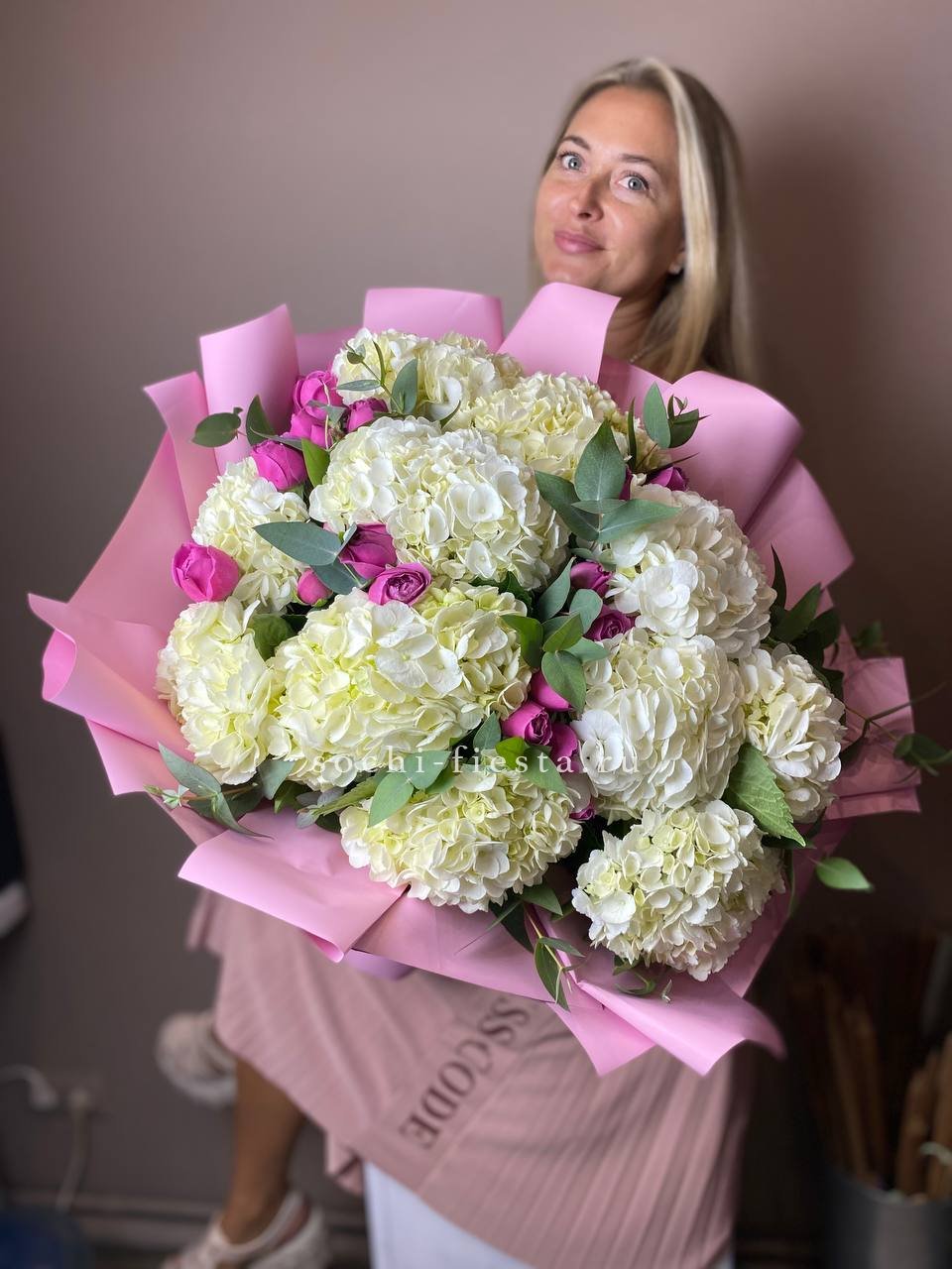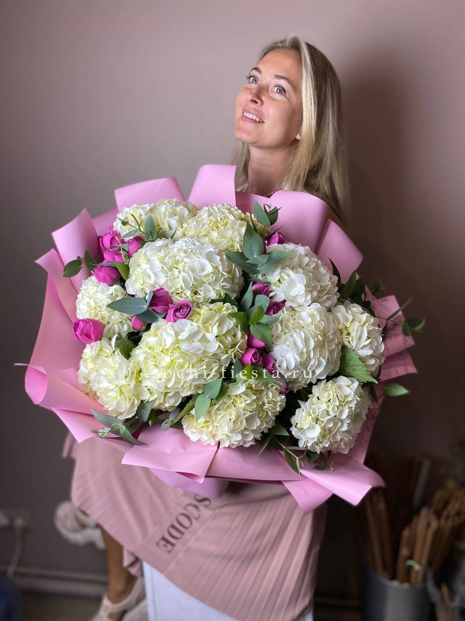 вывернутые розы, гортензия, пионовидные розы, эустома, лента, авторская упаковка.
