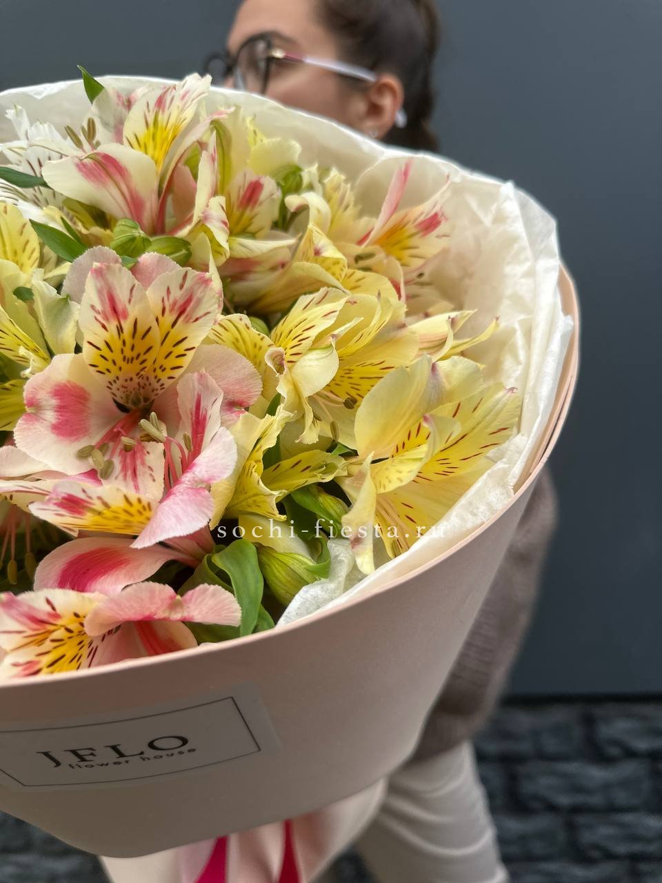 Девять альстромерий в воздушной упаковке пастельных оттенков выглядят мягко и свежо. Бутоны разной степени раскрытия добавляют букету глубины и лёгкой игривости.