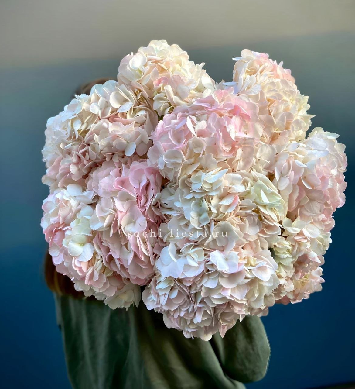 Девятнадцать соцветий гортензии собраны в объемную композицию с естественной воздушностью. Каждая головка раскрывается множеством мелких лепестков, создавая плотное цветовое облако.