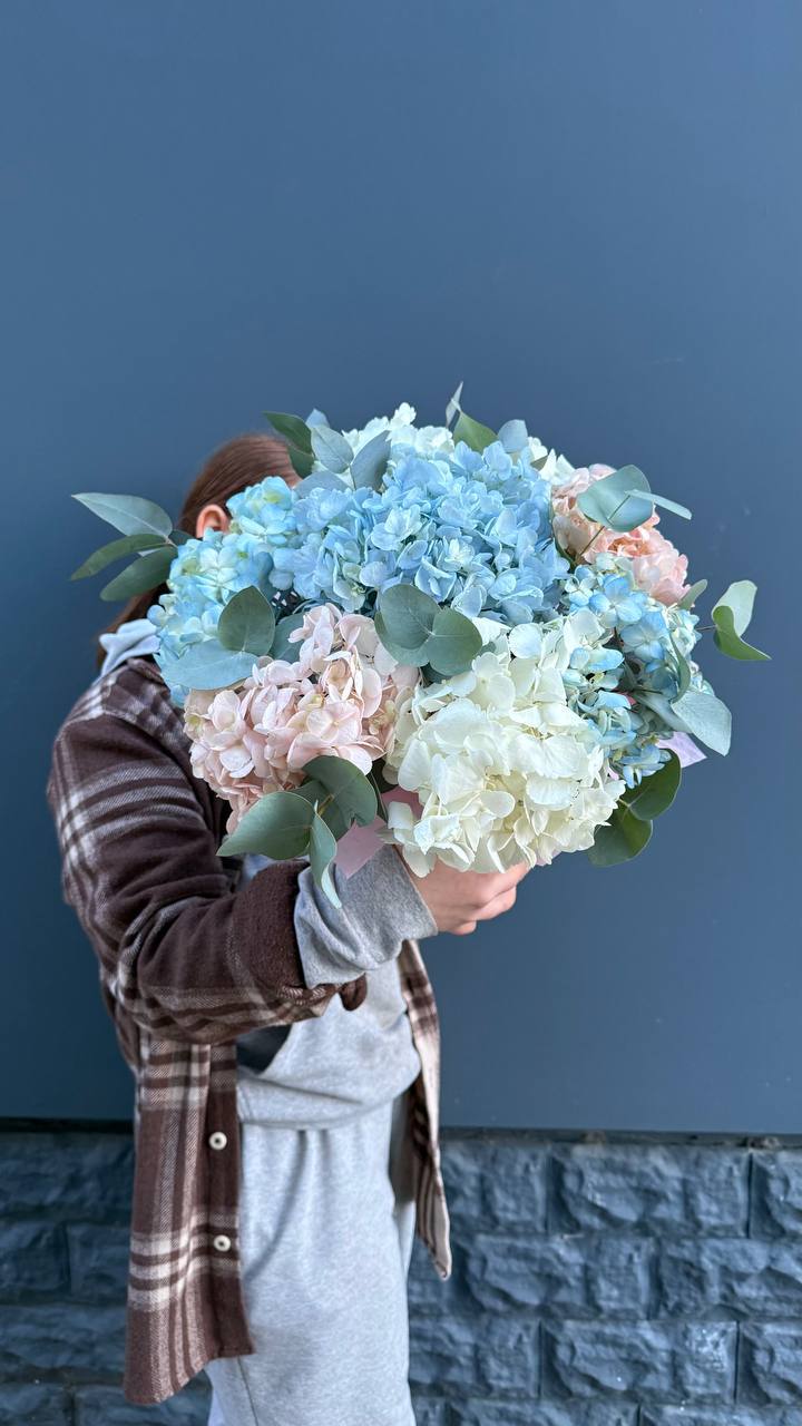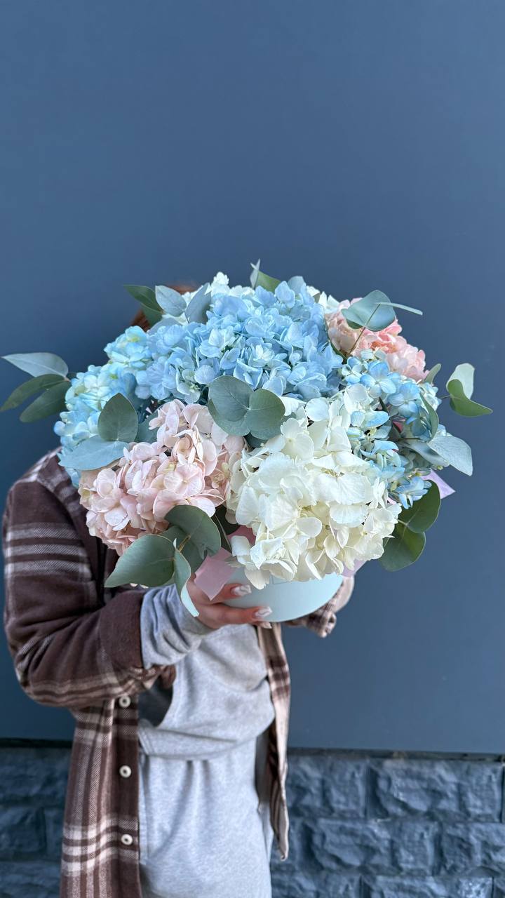 Пятнадцать соцветий гортензии образуют густую сферу с насыщенной глубиной цвета. Объёмная композиция заполняет пространство и притягивает внимание своей плотностью.