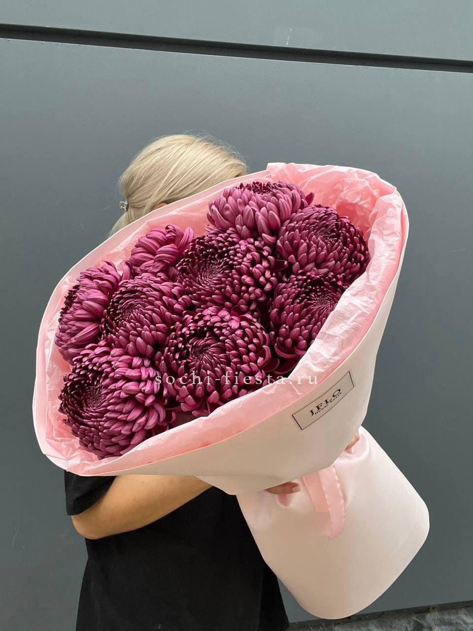 Девять хризантем бигуди выстраиваются в воздушную композицию с игольчатыми лепестками. Каждый бутон раскрывается лучистой звездой, создавая объёмную фактуру и динамичный силуэт.