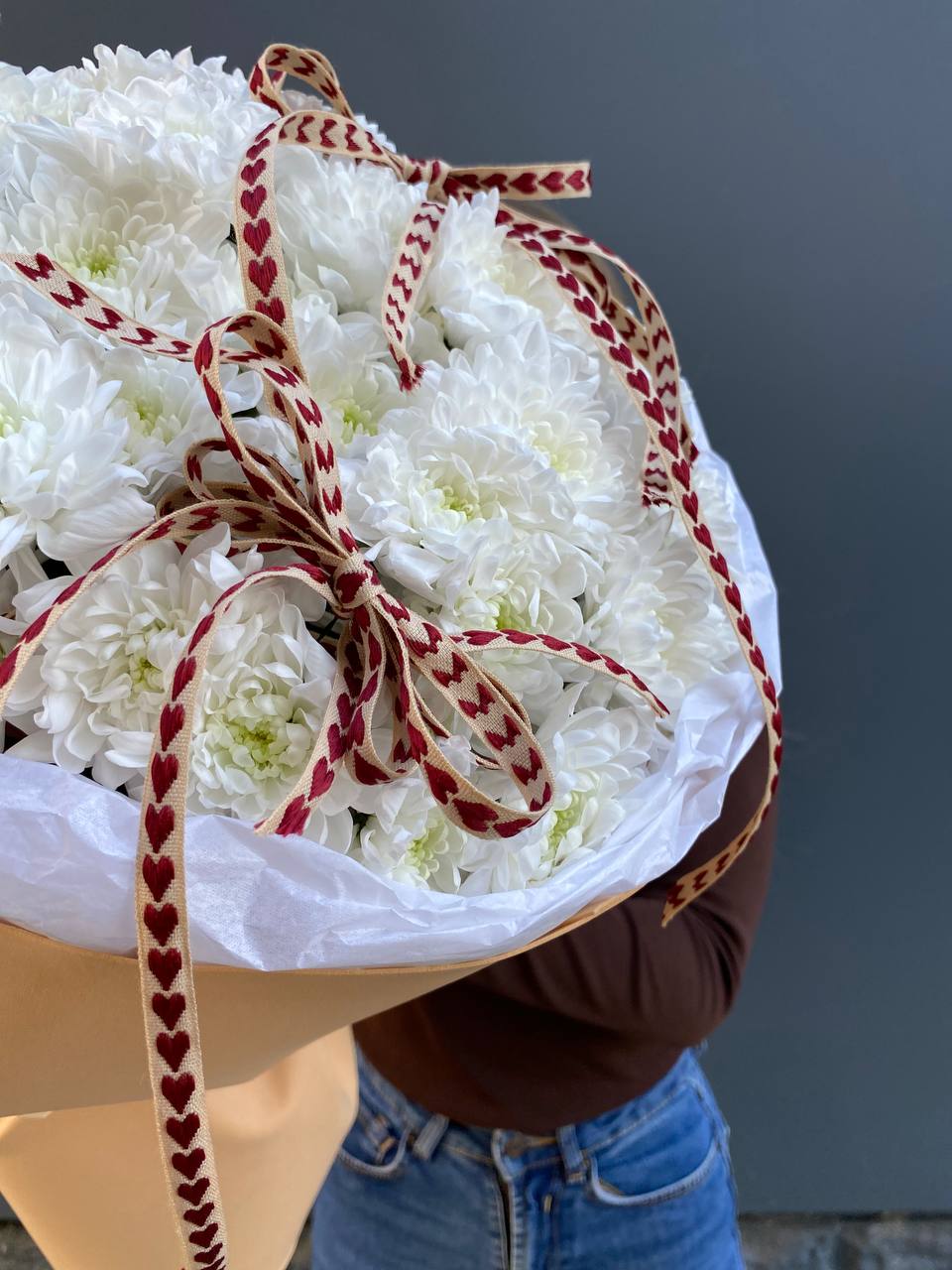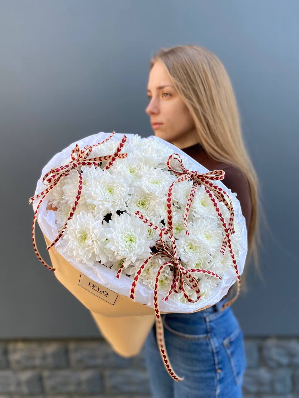 Крупные соцветия одноголовых хризантем раскрываются во всей полноте. Плотные лепестки образуют графичные круги, а сдержанная упаковка сохраняет чистоту формы.