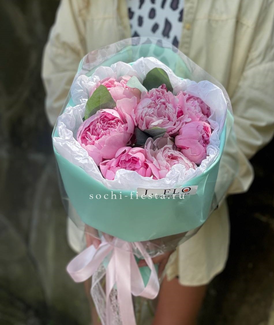 7 розовых пионов сорта Сара бернар, эвкалипт, лента, фоамиран, тишью.