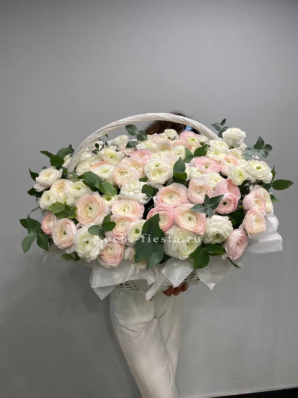 на фото 113 ранункулюсов микс  с эвкалиптом в корзине Вы можете согласовать с менеджером любое количество) Такой объём лучше заказывать за 1.5 недели)