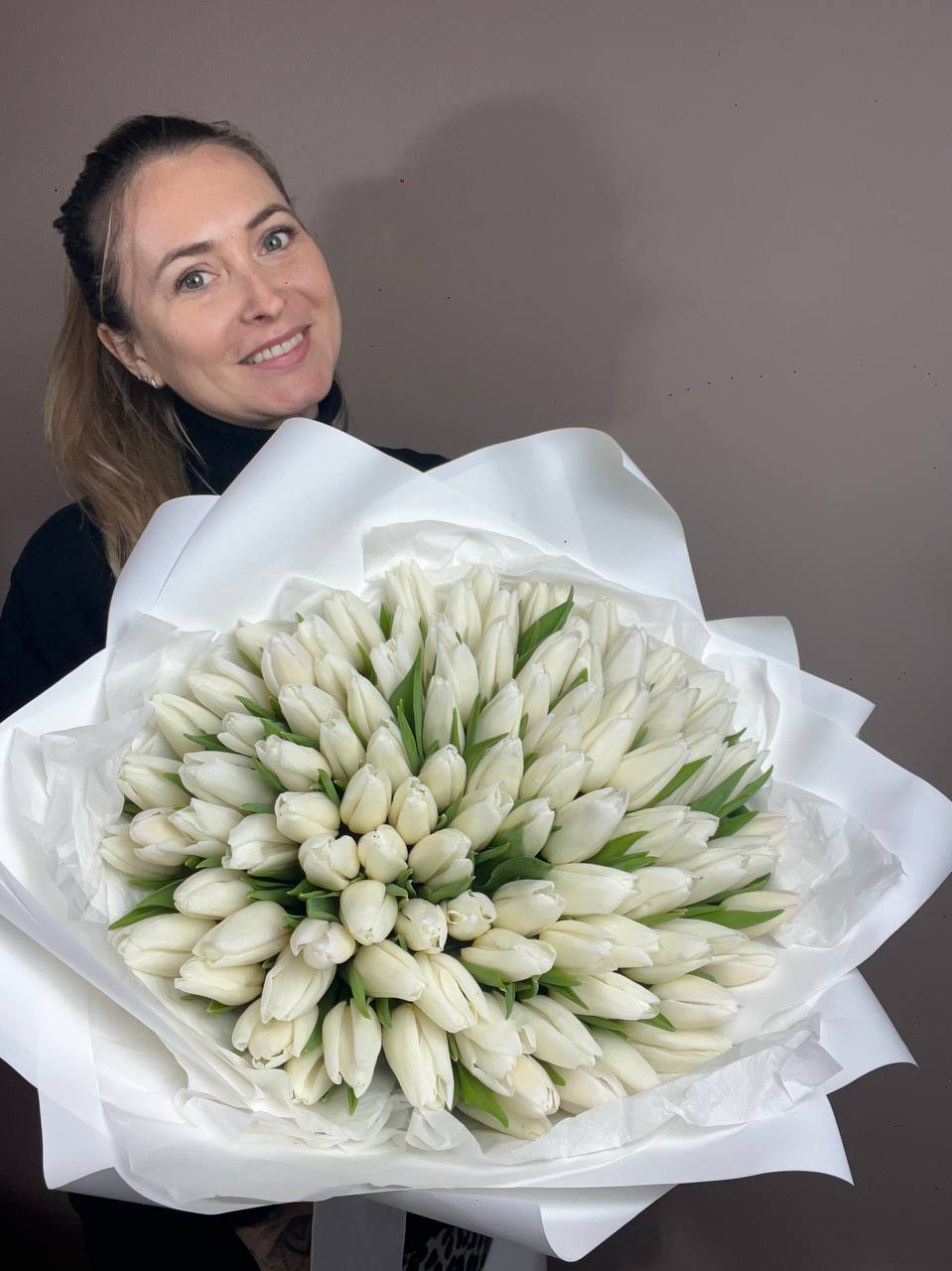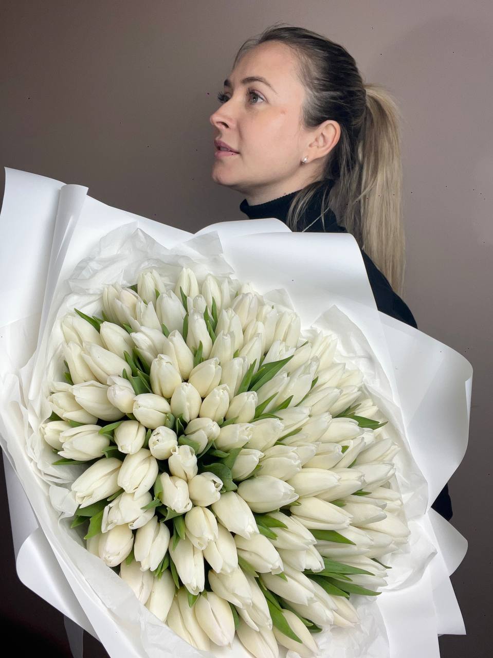Сто один тюльпан ярко-красного цвета собраны в плотную вертикальную композицию. Весенняя свежесть и насыщенный оттенок лепестков создают мощное цветовое пятно, которое оживляет любое пространство.