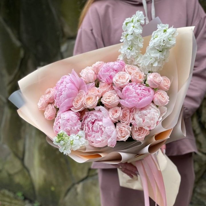 авторский букет из ранункулюса анемонов и нигеллы в нежной сиренево-персиковой гамме для подарка в региональном городе авторский свадебный букет из пионов и клематиса в кремово-белой гамме для невесты в региональном городе