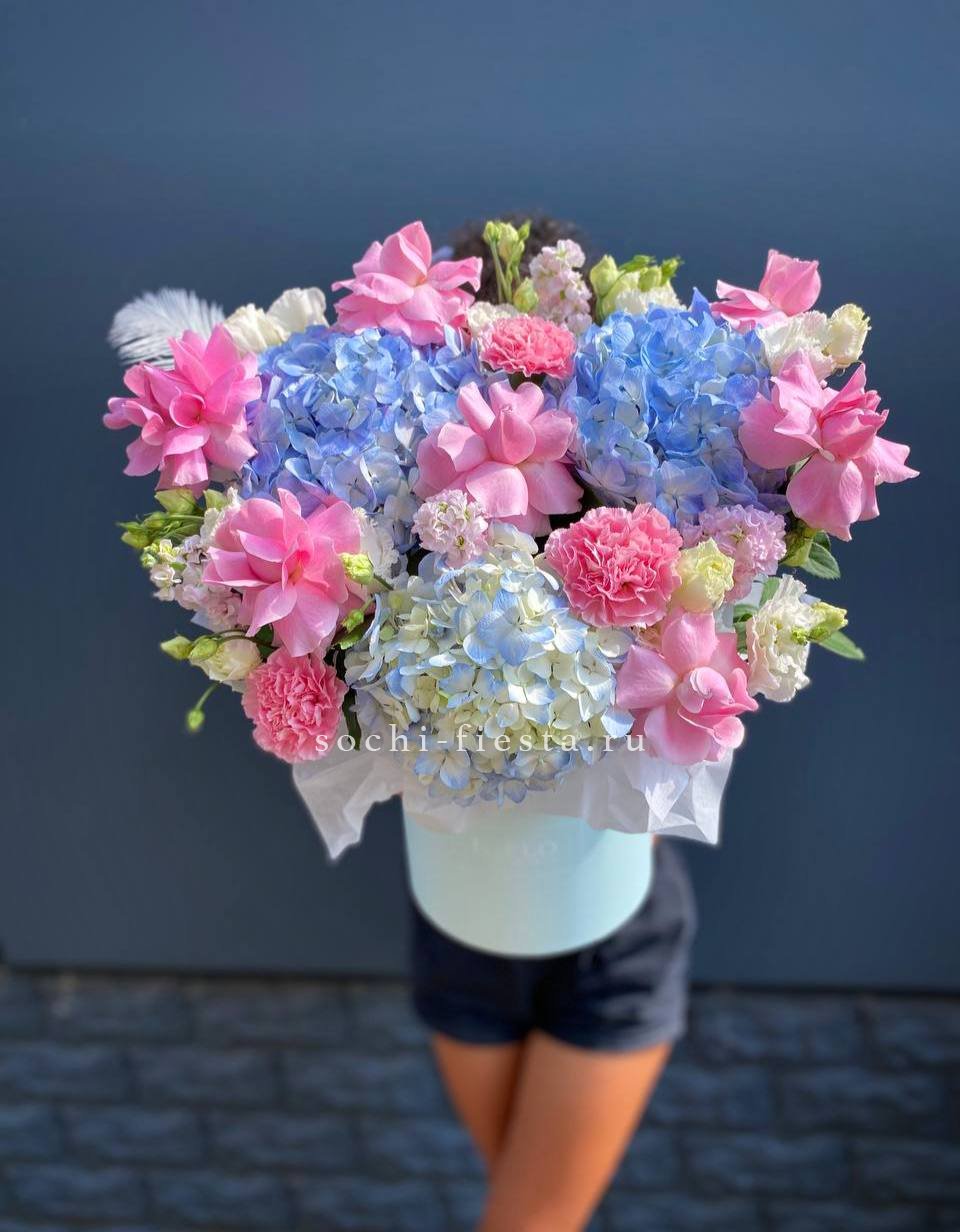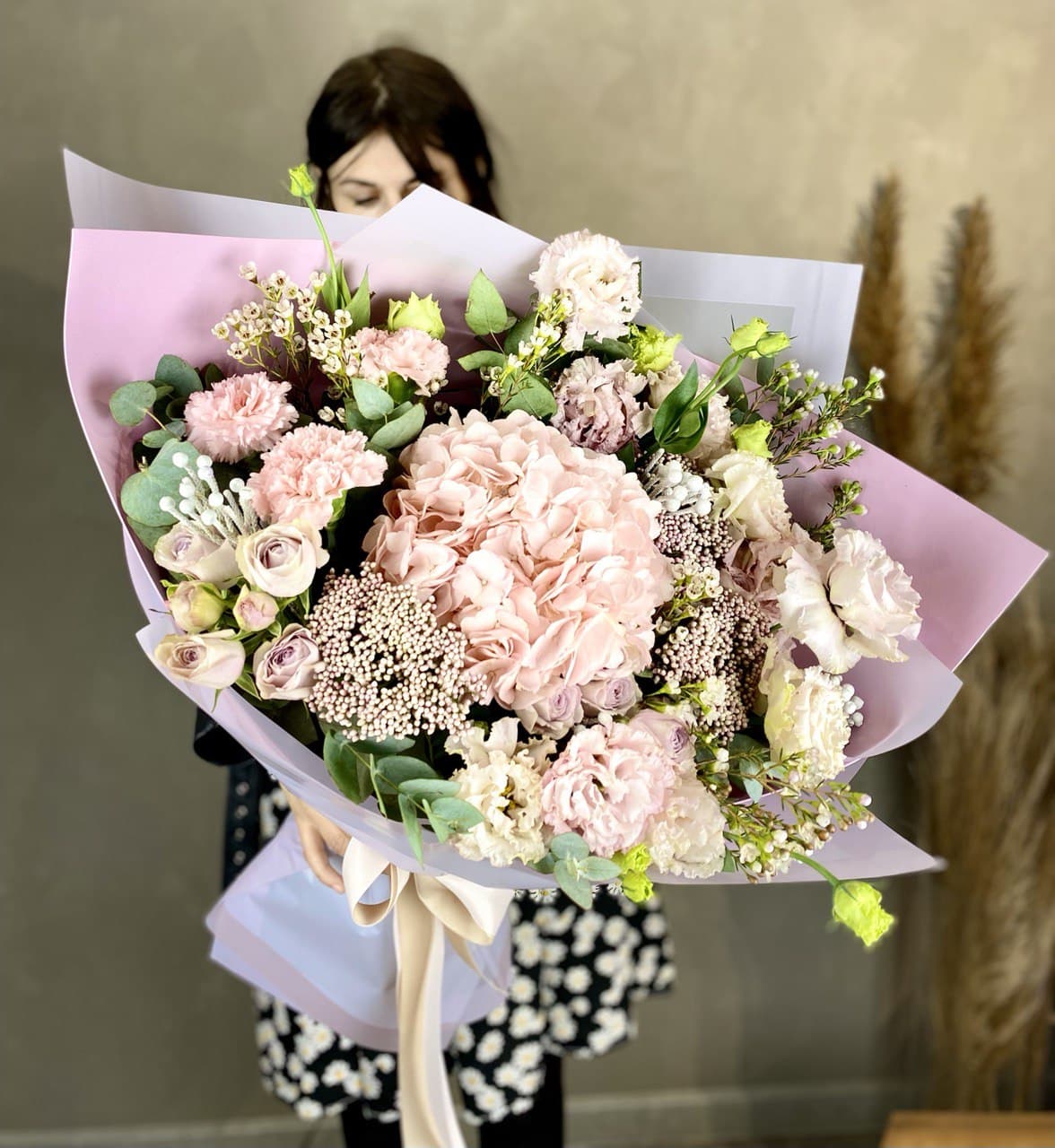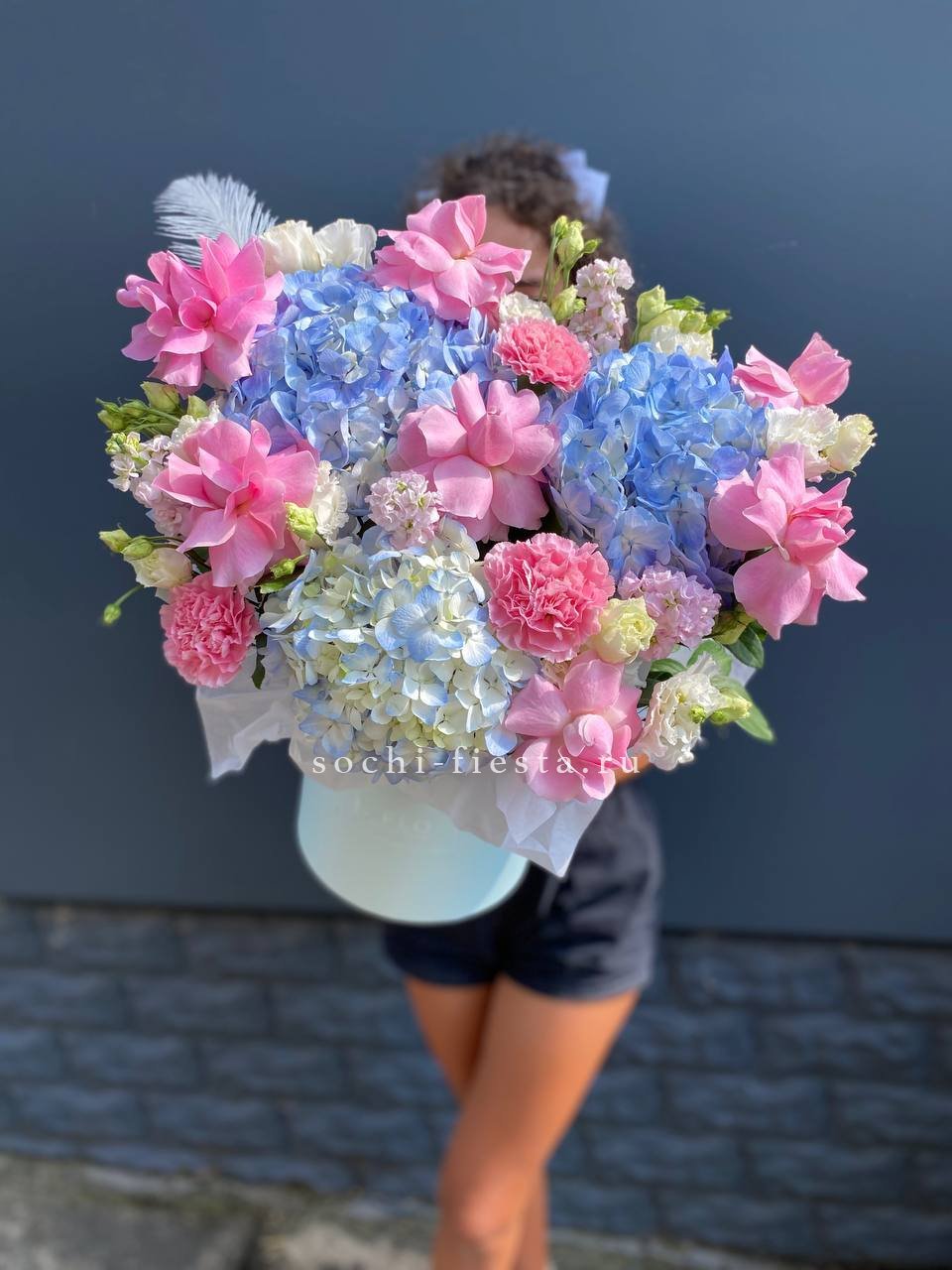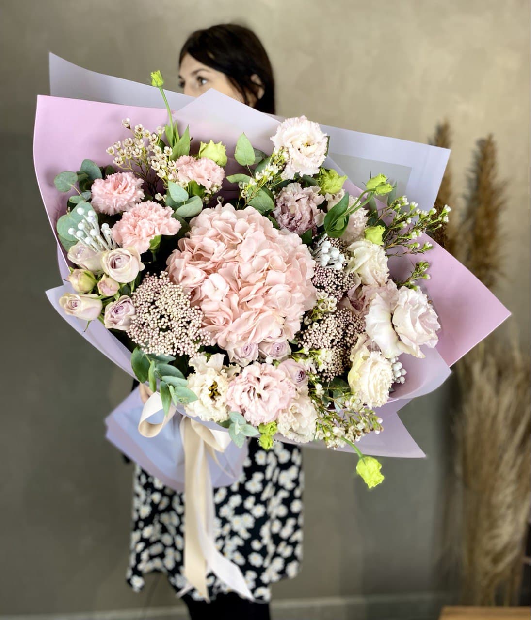 гортензия, диантус, кустовая пионовидная роза, эустома, орхидеи (или аналог), эвкалипт, лента, дизайнерская упаковка.