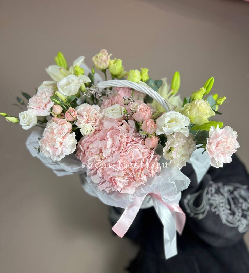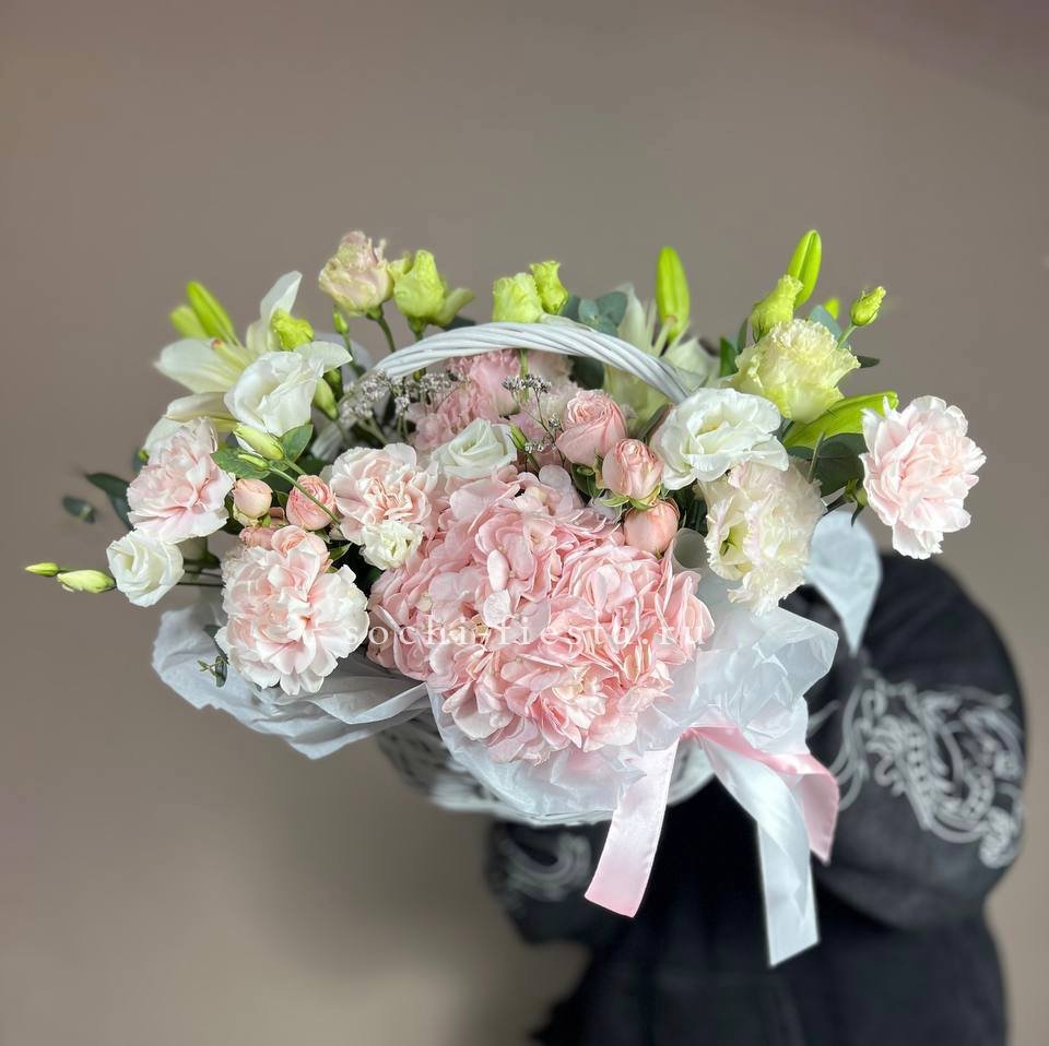 Пышные шапки гортензии переплетаются с бархатными бутонами пионовидных роз, создавая объёмную композицию насыщенного розового оттенка. Орхидеи и эустома добавляют воздушности, а диантус расставляет яркие точки. Букет заполняет пространство и притягивает взгляд своей плотной структурой.