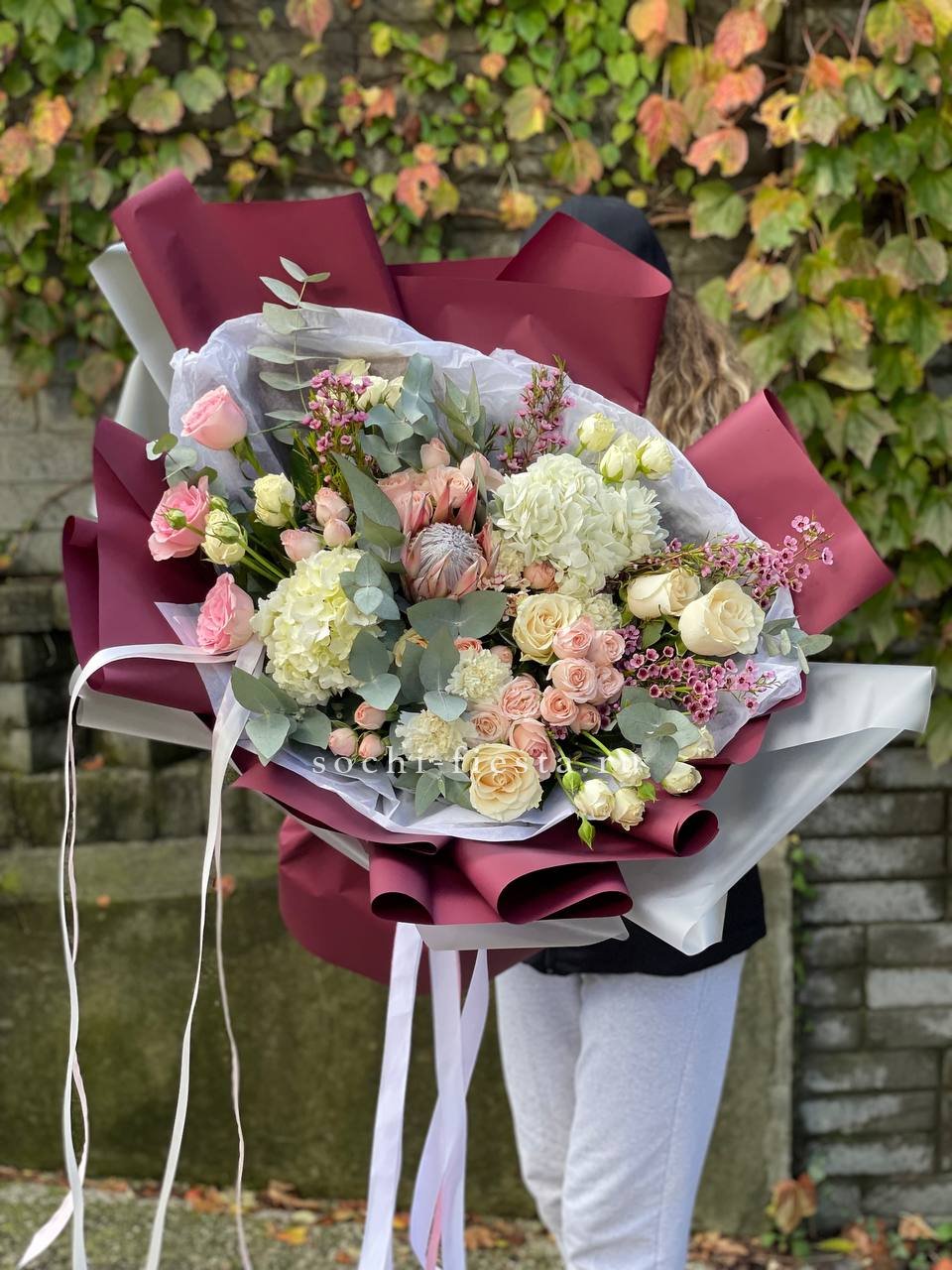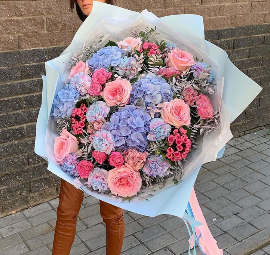 гортензии, роза одноголовая, роза кустовая, гербера, озотамнус, диантус, эвкалипт, декоративные перья, лента, дизайнерская упаковка.
