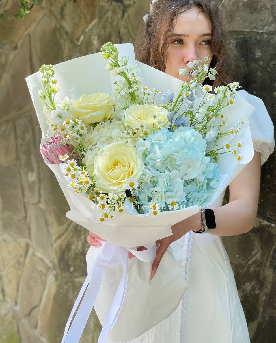 гортензия, розы одноголовые, дельфиниум (аналог вне сезона), ромашка, протея, маттиола (аналог вне сезона), лента, дизайнерская упаковка.