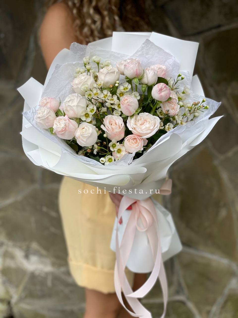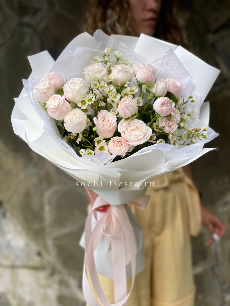 розы, пионовидные кустовые розы, диантусы, эвкалипт, лента, дизайнерская упаковка.