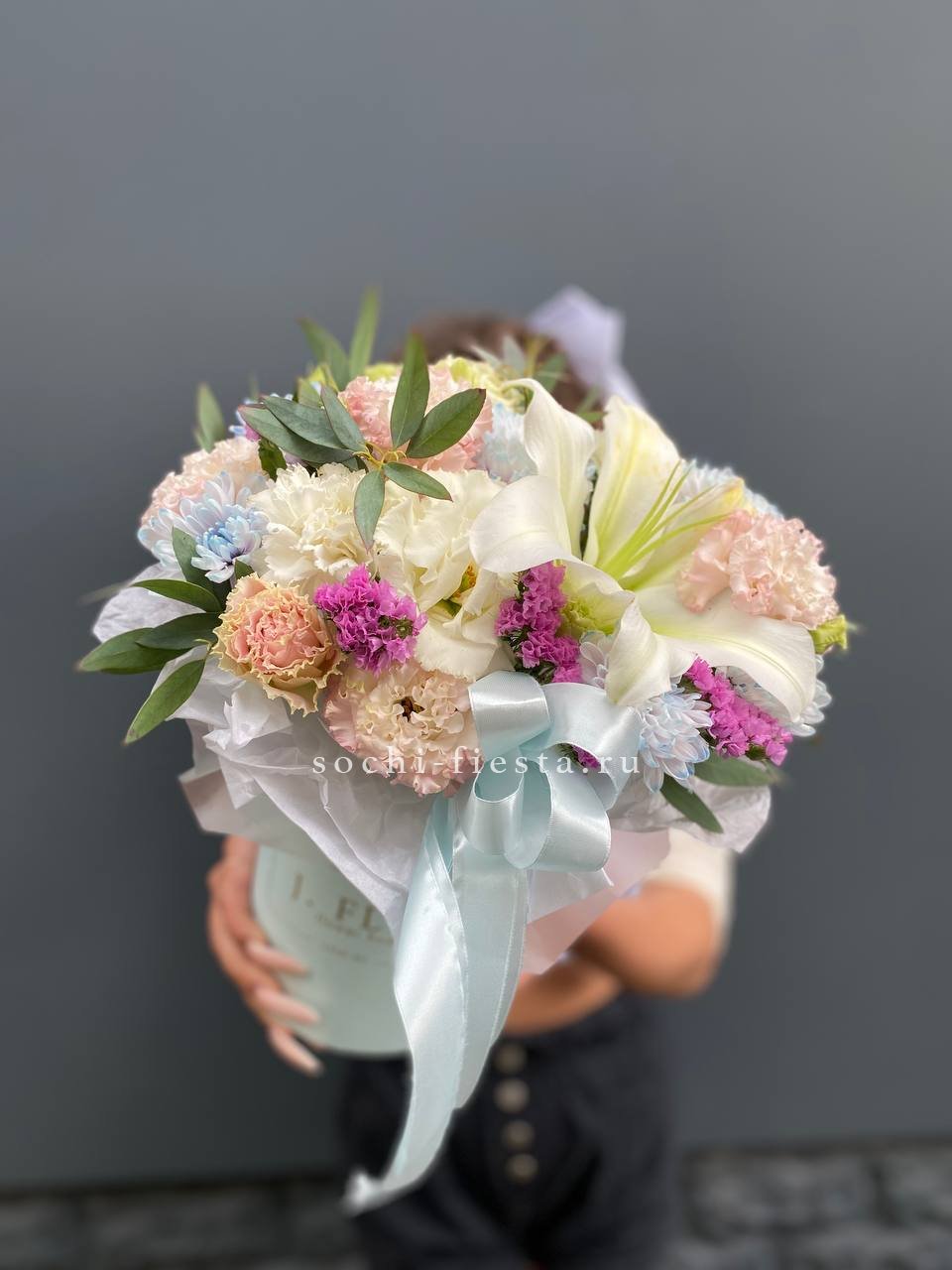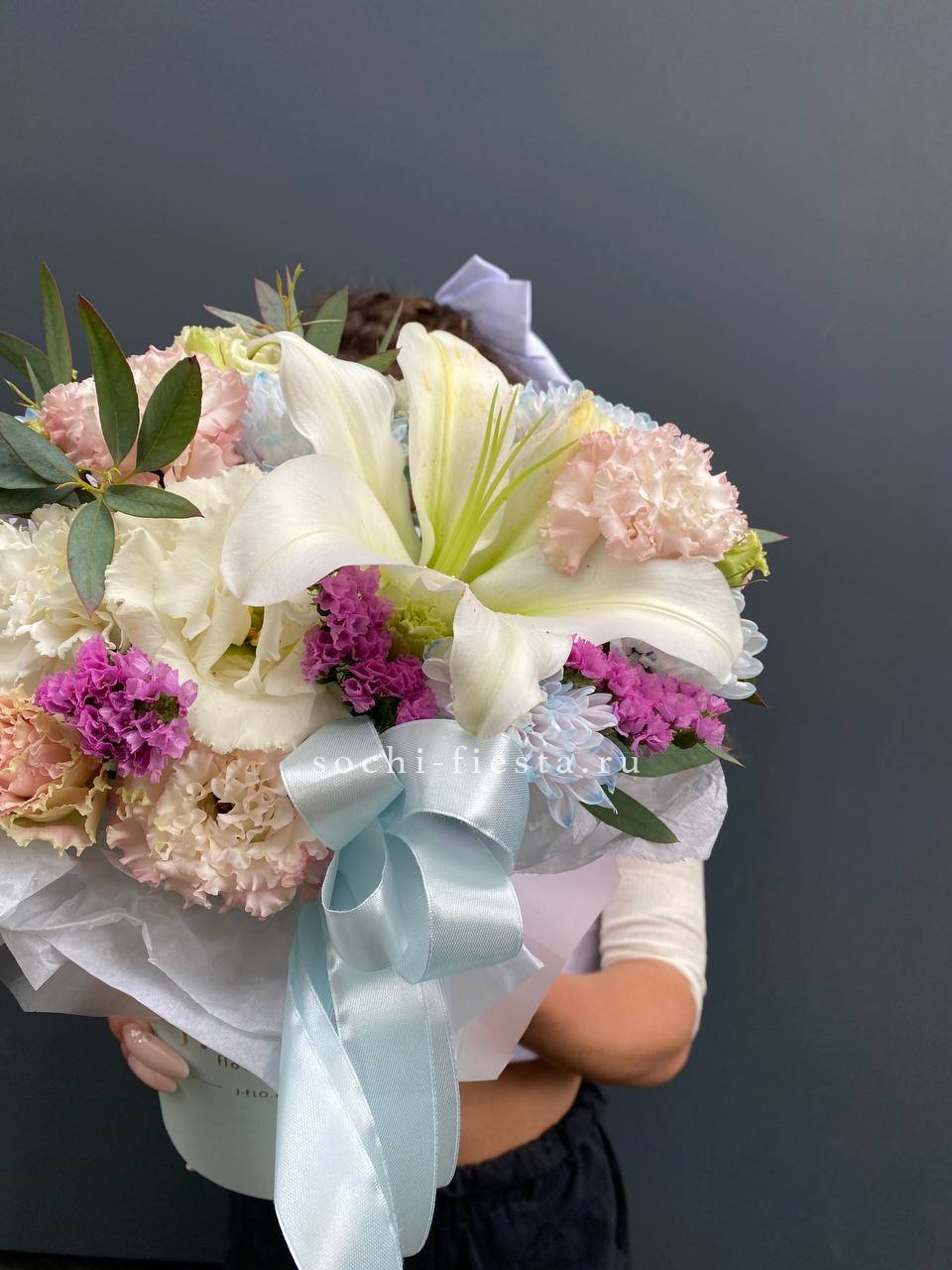 лилии, диантусы, хризантемы, эустома, статица, эвкалипт, цилиндр.