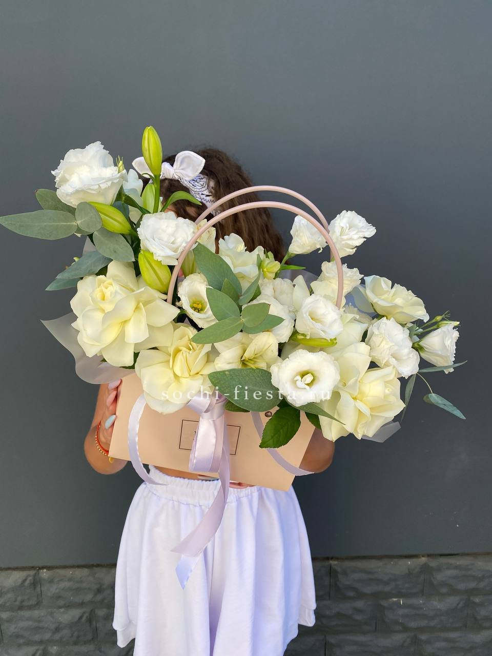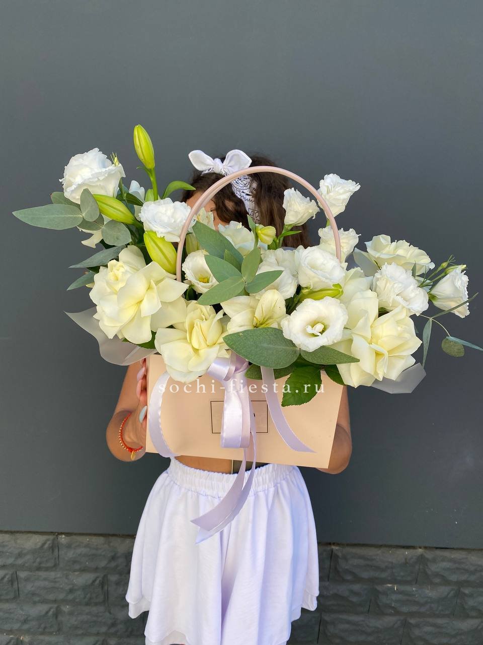 герберы, эустома, белая роза, эвкалипт, лента, сумка-кашпо.