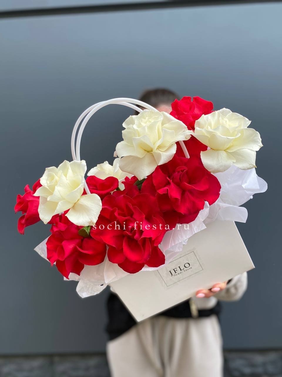 Белоснежные розы и воздушная эустома соседствуют с пышной гортензией и яркими вспышками статицы. Композиция собрана плотно, каждый цветок находит своё место в общем ритме.