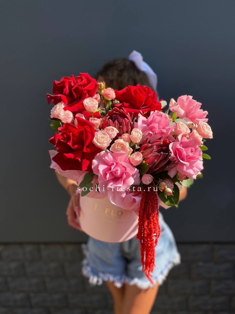 пион, розы одноголовые, гортензия, пионовидная роза, тишью, коробка D13 Цвет коробки может быть согласован с заказчиком.
