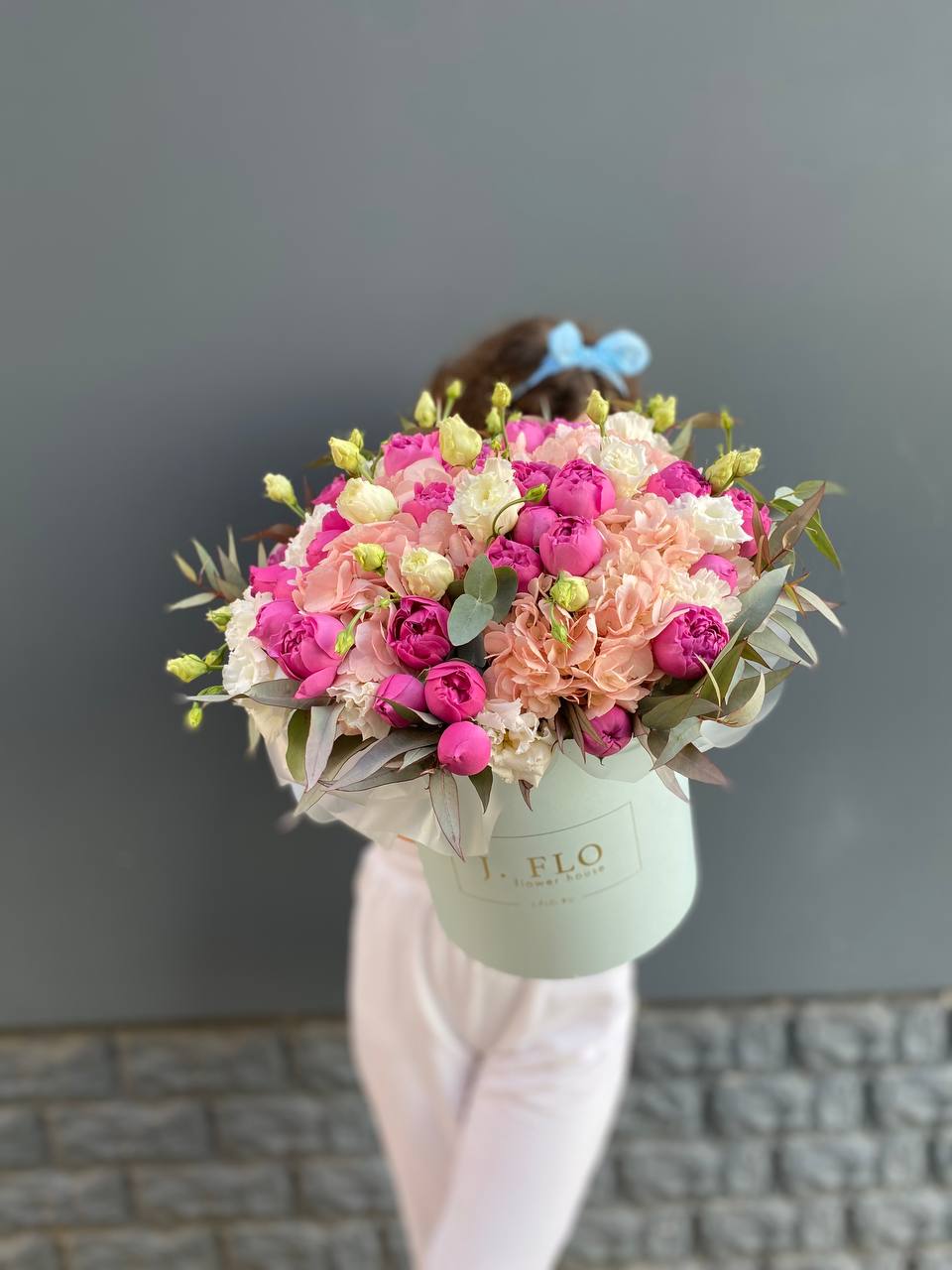 Пионовидные розы раскрываются пышными шапками среди воздушной гортензии и эустомы. Композиция собрана в круглом боксе и держит форму без дополнительной упаковки.