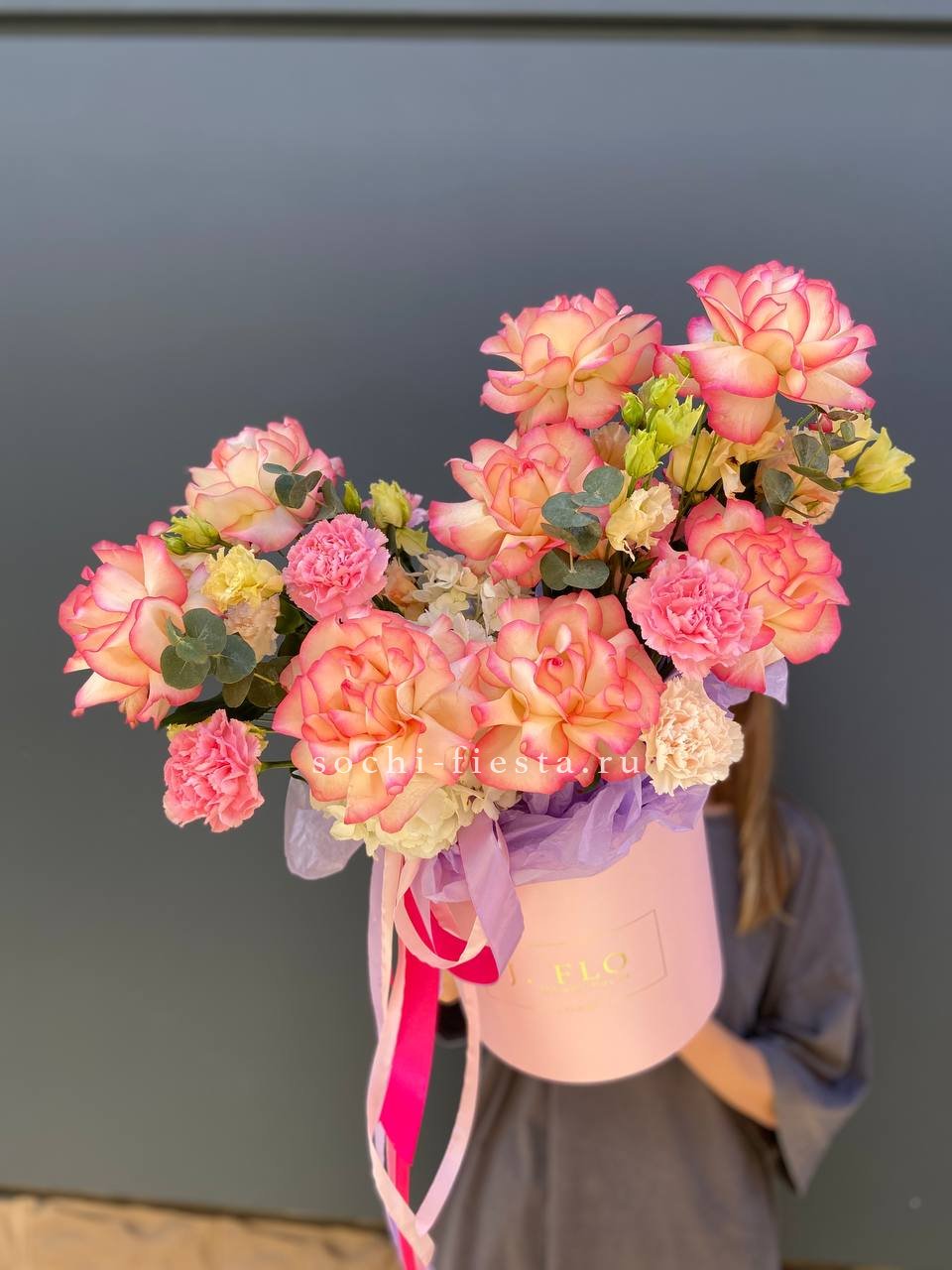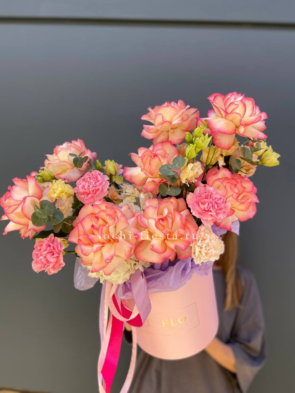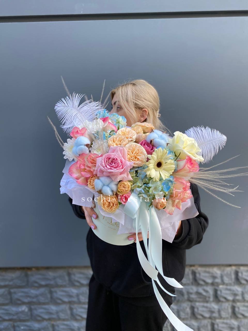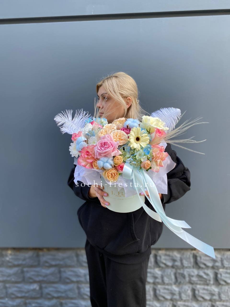 Композиция в коробке объединяет пышную гортензию, воздушную эустому и кустовые розы, Джумилию с яркими гербами и хлопком. Плотное заполнение создает округлую форму, где каждый цветок находит свое место без пустот.