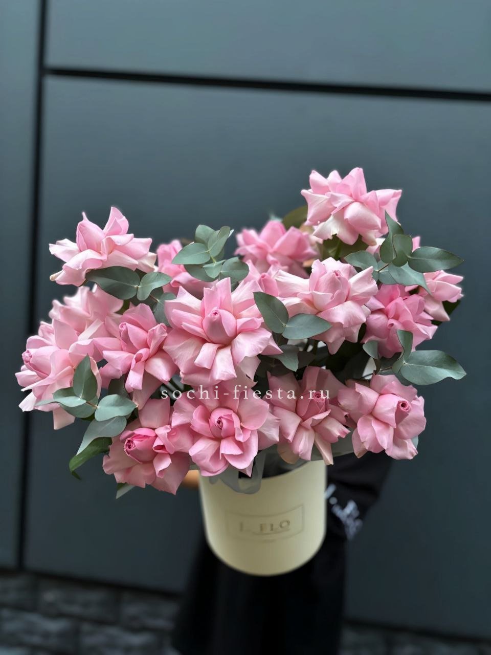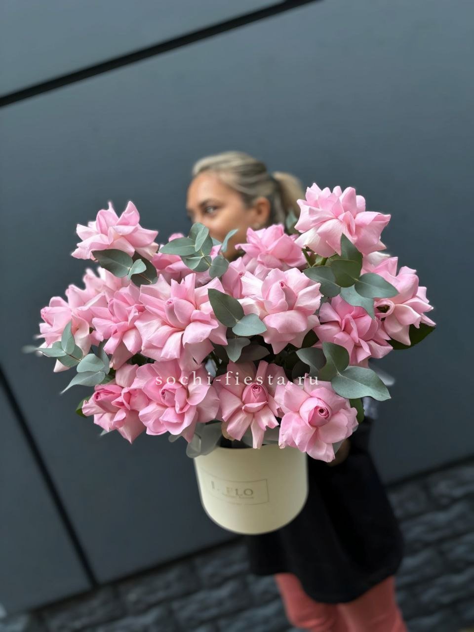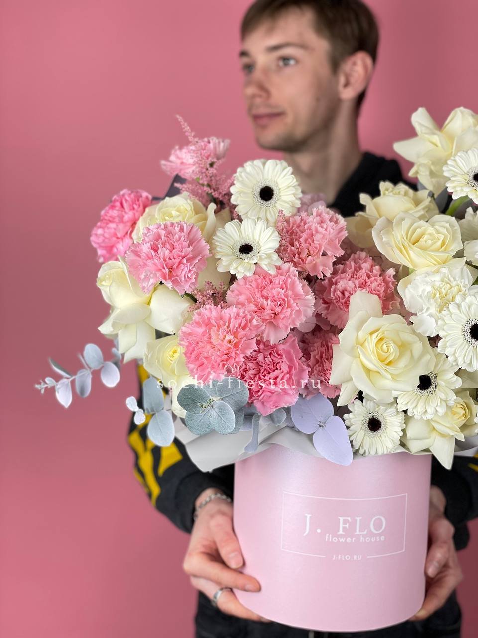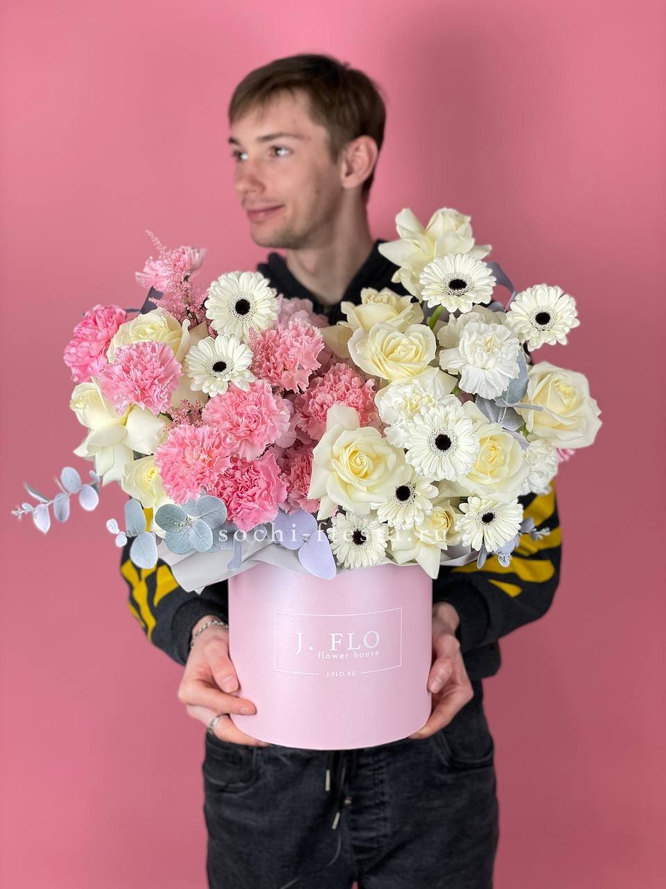 Композиция в коробке объединяет пышную гортензию, воздушную эустому и кустовые розы, Джумилию с яркими гербами и хлопком. Плотное заполнение создает округлую форму, где каждый цветок находит свое место без пустот.