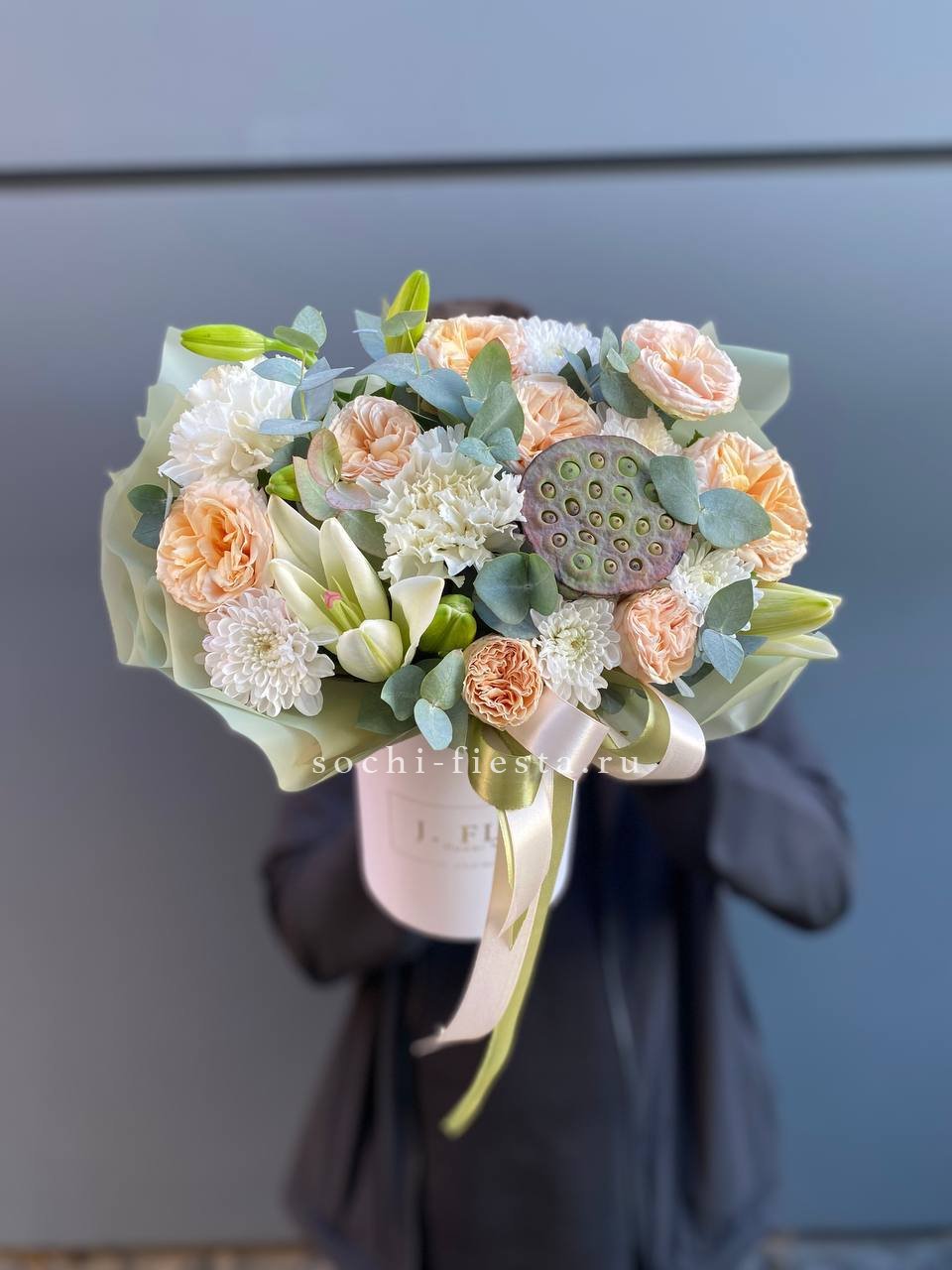 кустовая роза, лилия, диантус, лотос, эвкалипт, бокс 13.