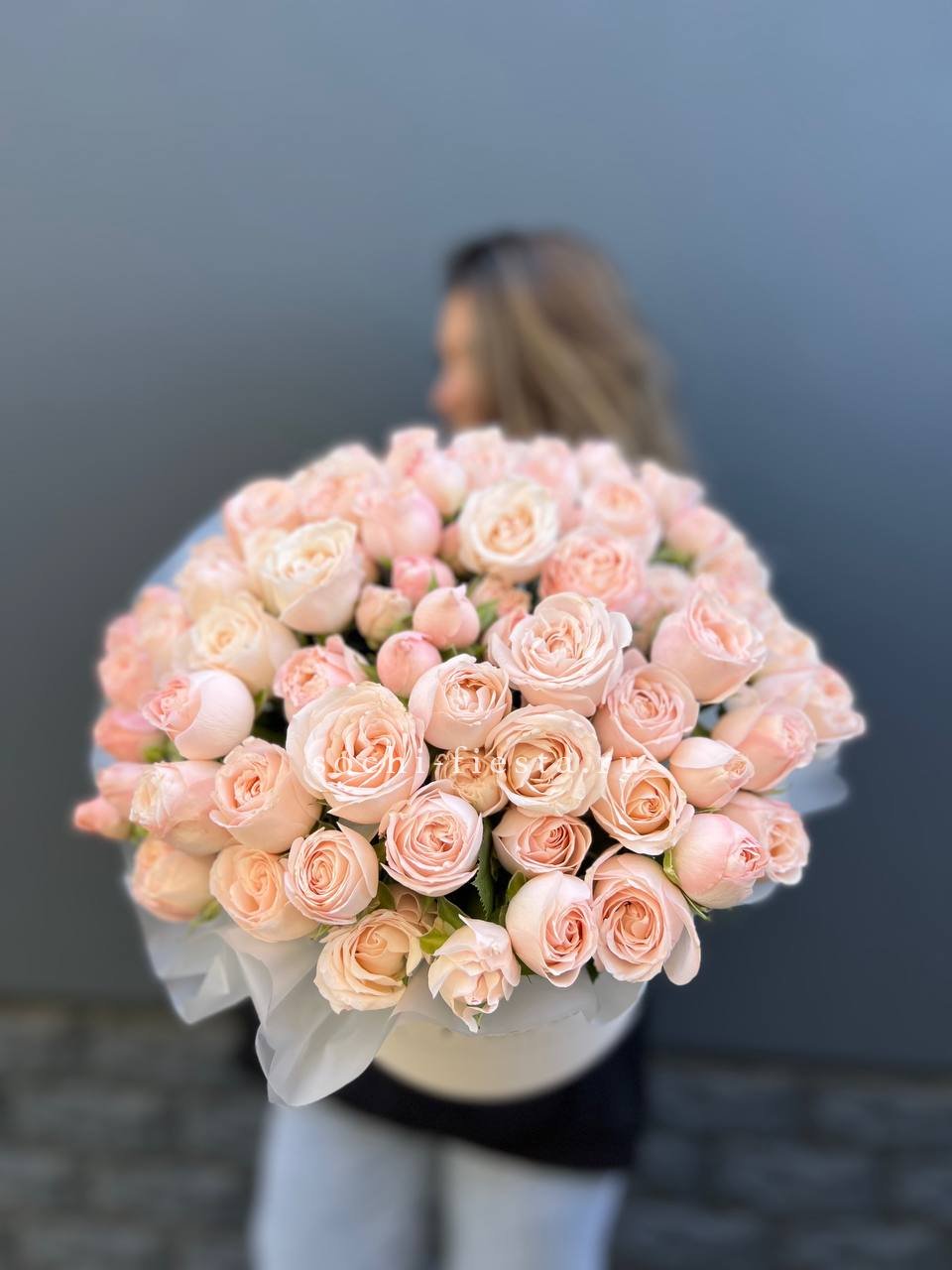 Тридцать одна веточка кустовой розы Бомбастик собрана в пышный объём. Махровые бутоны формируют dense структуру с глубокими переливами персиковых тонов.