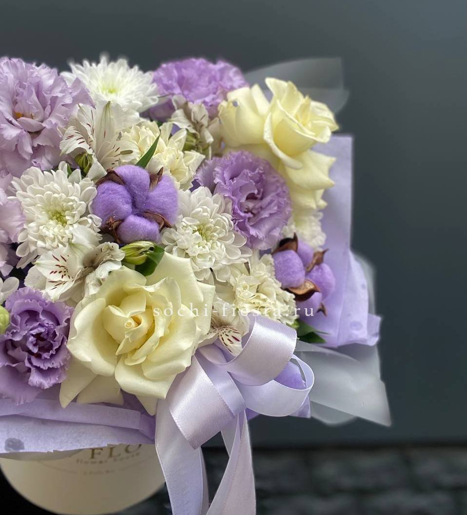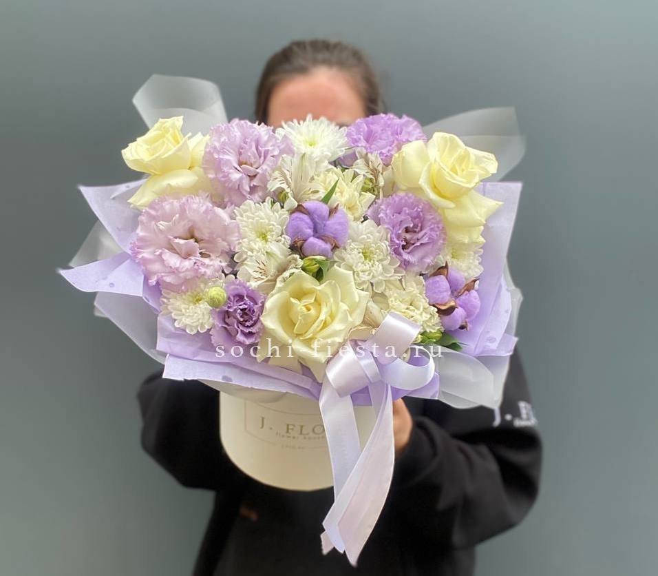 Композиция собрана из альстромерий, эустомы и хризантем с добавлением воздушного хлопка. Мягкие оттенки и разная фактура бутонов создают живописный объем. Дизайнерская упаковка завершает образ.
