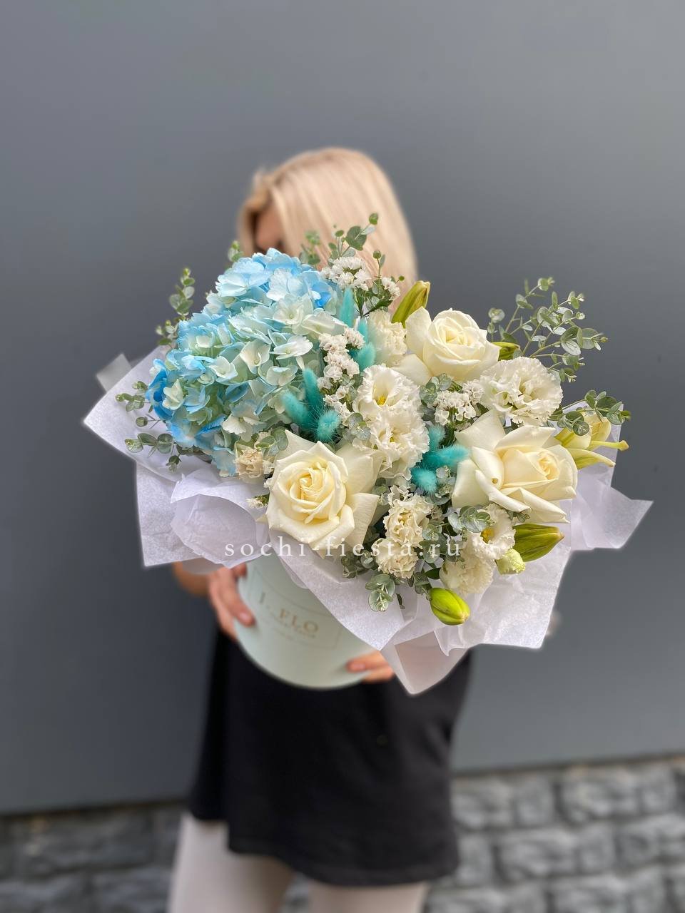 Белоснежная гамма раскрывается через лилии, розы и пышную гортензию с добавлением диантуса. Эвкалипт придает объём и глубину всей композиции в цилиндре.