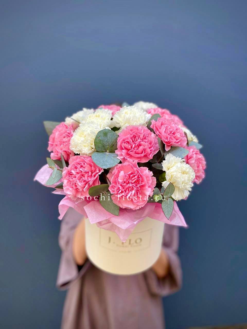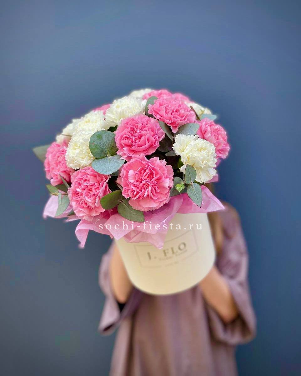 Пышные головки диантуса собраны плотной шапкой в круглой коробке. Ветви эвкалипта создают воздушное обрамление. Минималистичная композиция с выраженной текстурой.