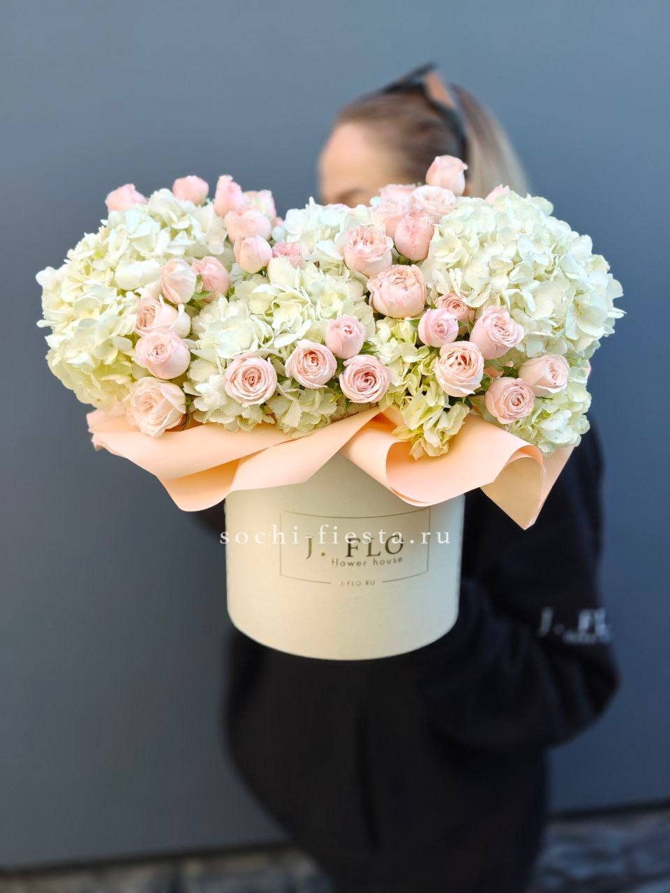 Пионовидные бутоны и шапки гортензии заполняют бокс густой textured массой. Композиция держит форму и создаёт ощущение цветочной волны в ограниченном пространстве.