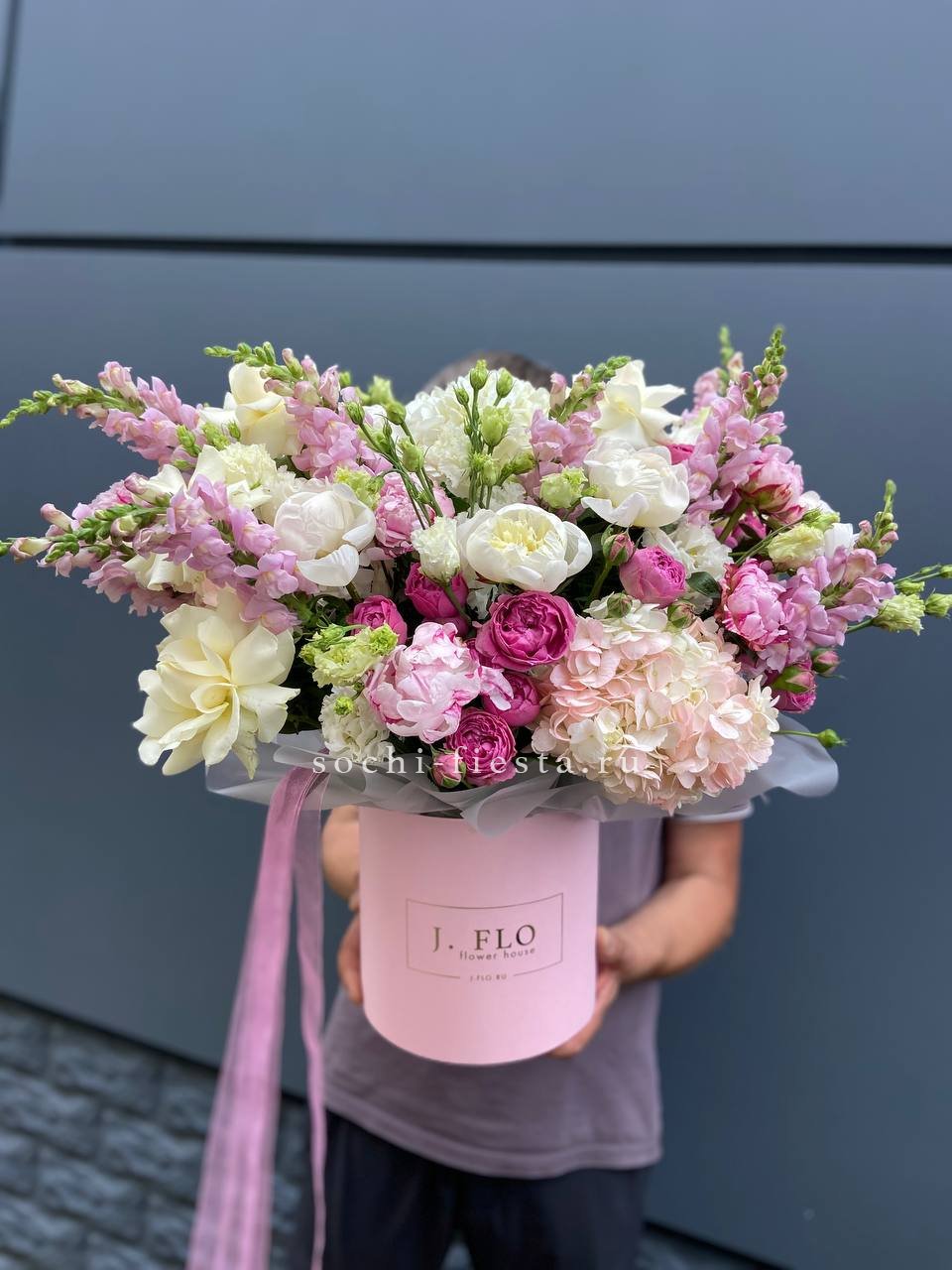 пионы, одноголовые розы, эустома, маттиола (аналог вне сезона), эвкалипт, мисти баблс, лента, цилиндр D20.
