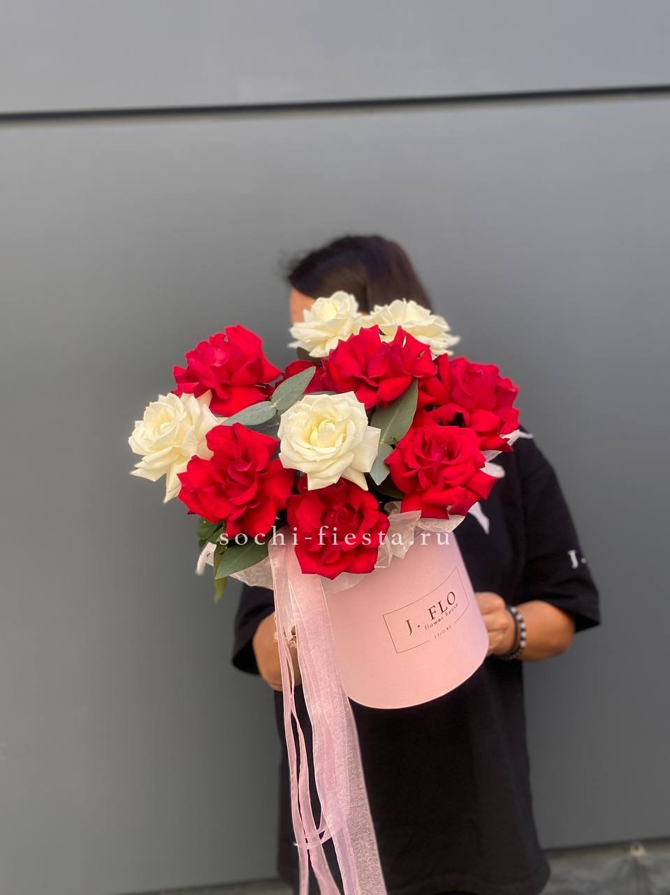 Кустовые розы собраны в плотную круглую форму и дополнены вертикальными стеблями вероники. Композиция в цилиндре выглядит графично и удерживает силуэт без дополнительных конструкций.