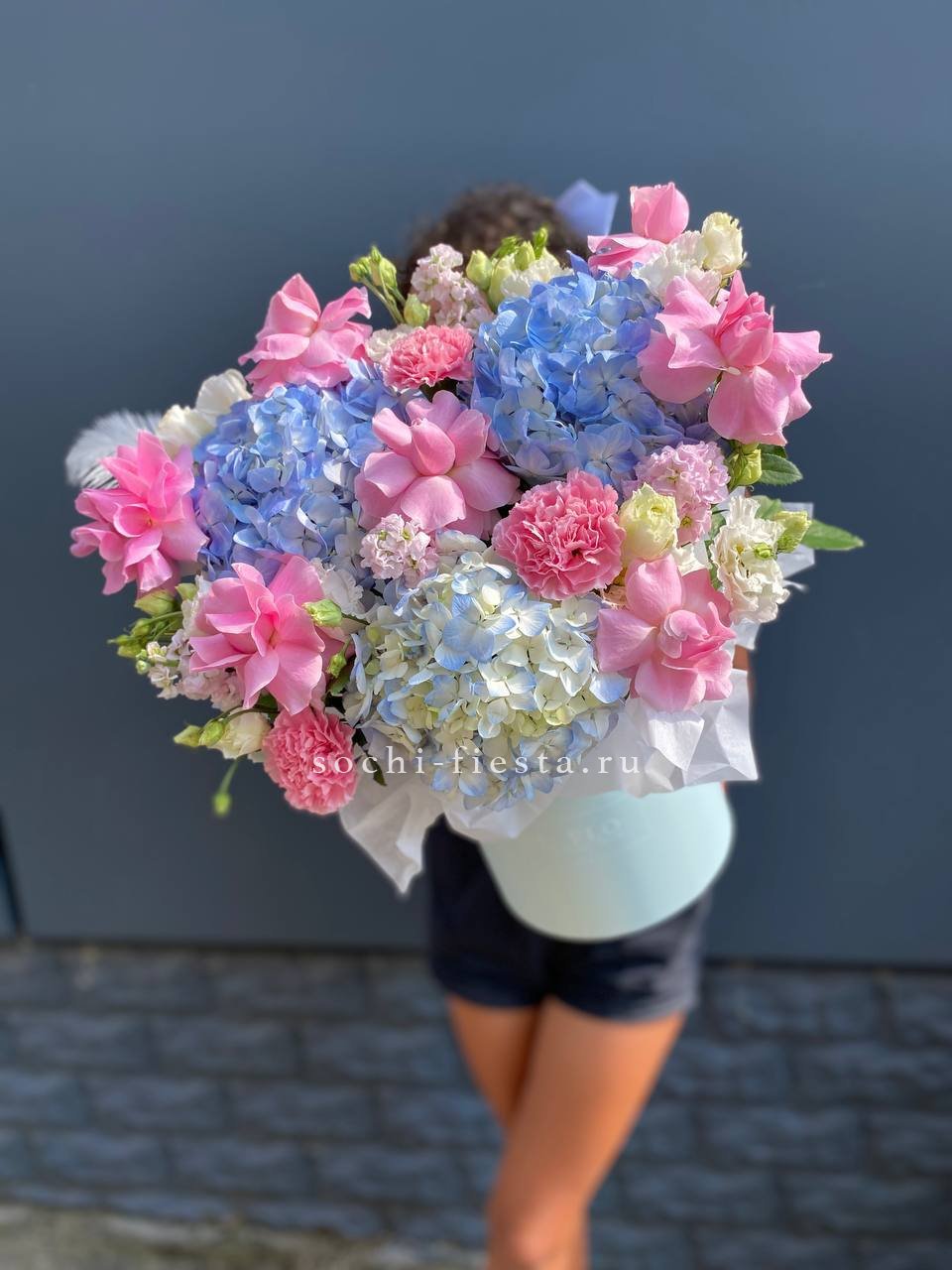 гортензии, розовые розы, маттиола (аналог), эустомы, перо, диантусы,  цилиндр D20, лента, упаковка.
