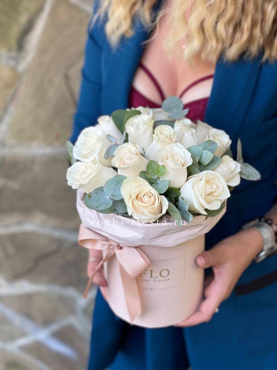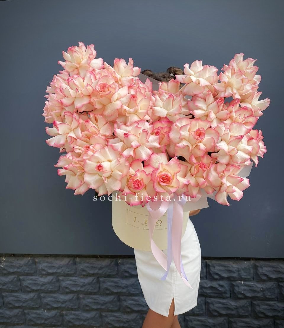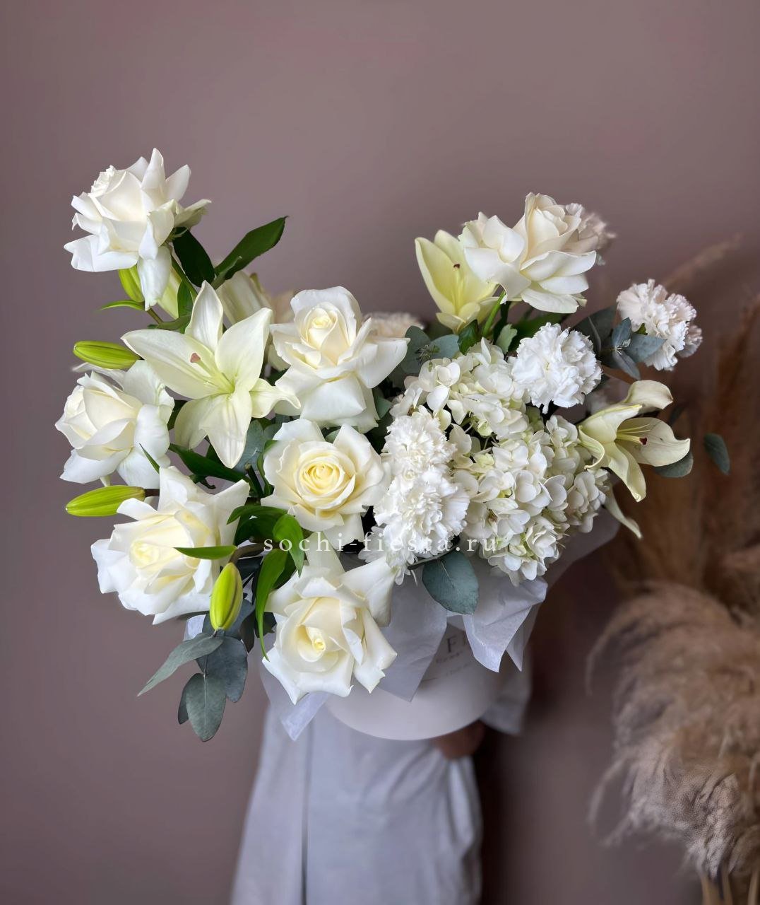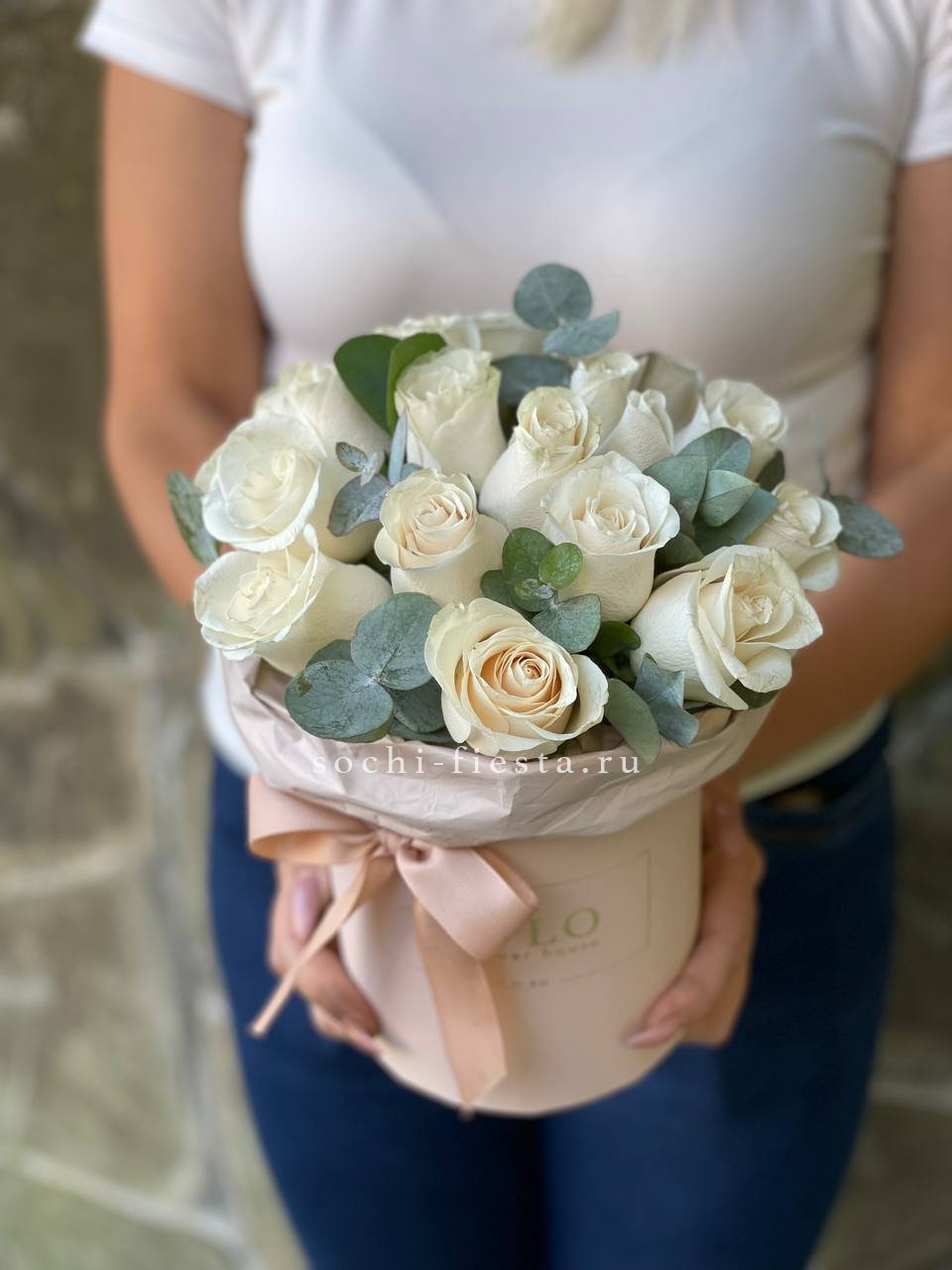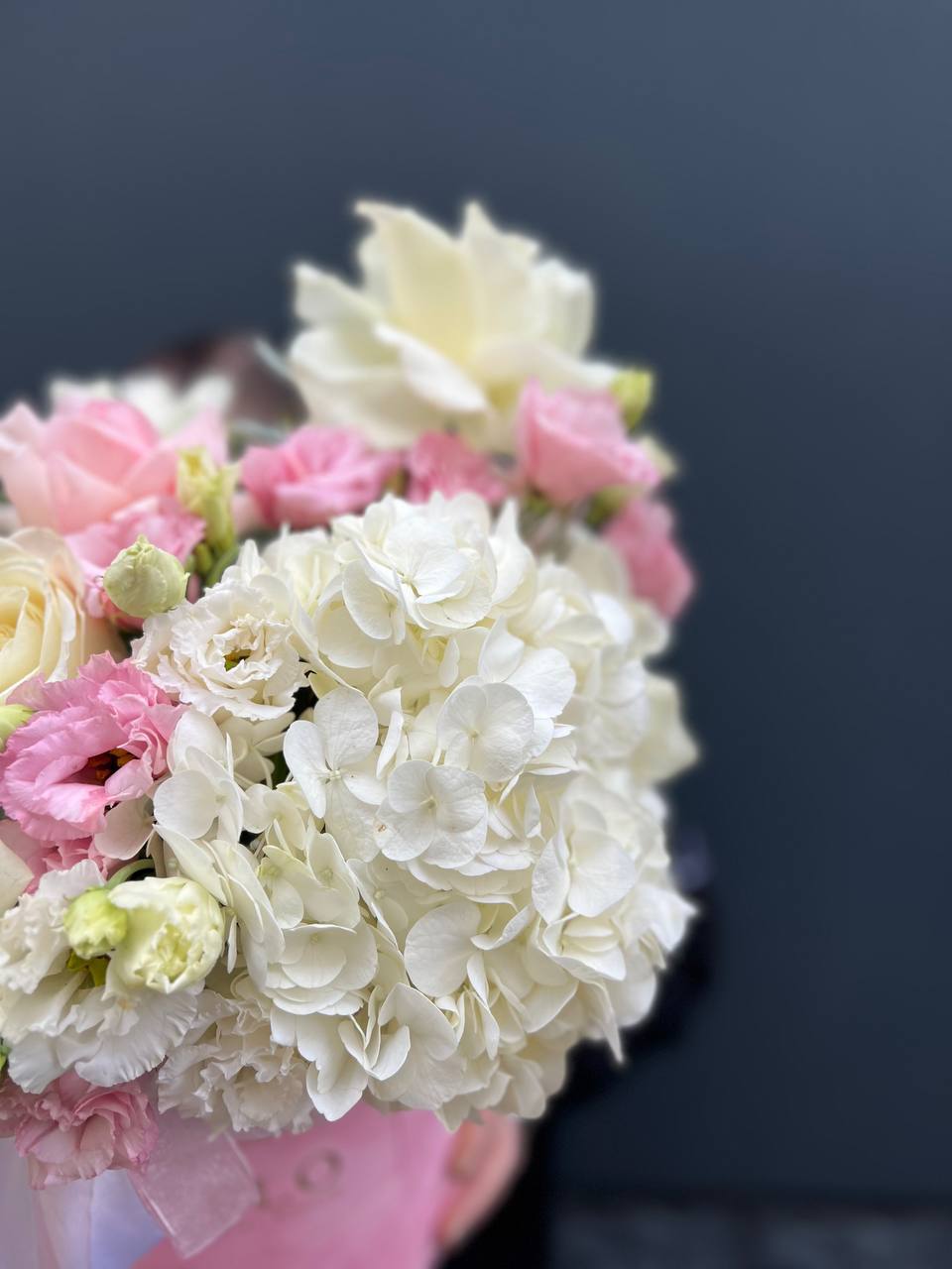 бокс, белая роза, розовая роза, эустома, гортензия, оазис.