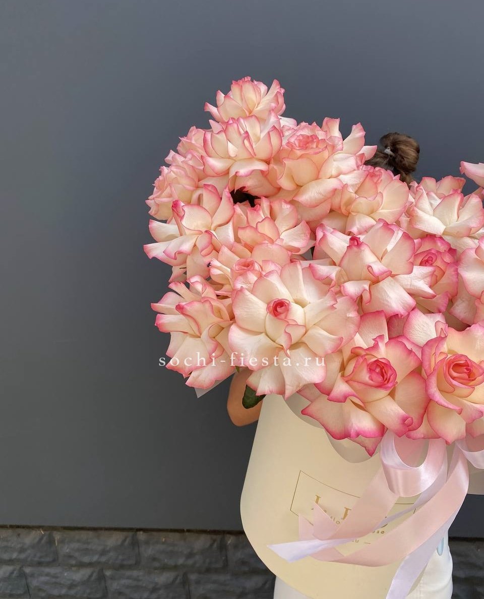 Воздушная композиция в бархатной коробке раскрывается пышными соцветиями гортензии и многолепестковыми бутонами эустомы. Розы двух оттенков создают мягкий переход от белоснежного к пудровому. Флористическая пена сохраняет свежесть каждого цветка надолго.