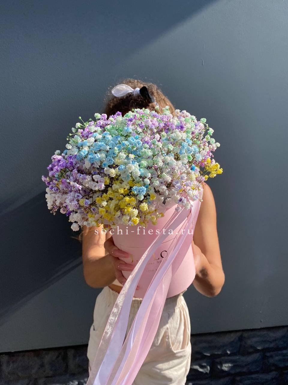 Радужные гипсофилы в шляпной коробке