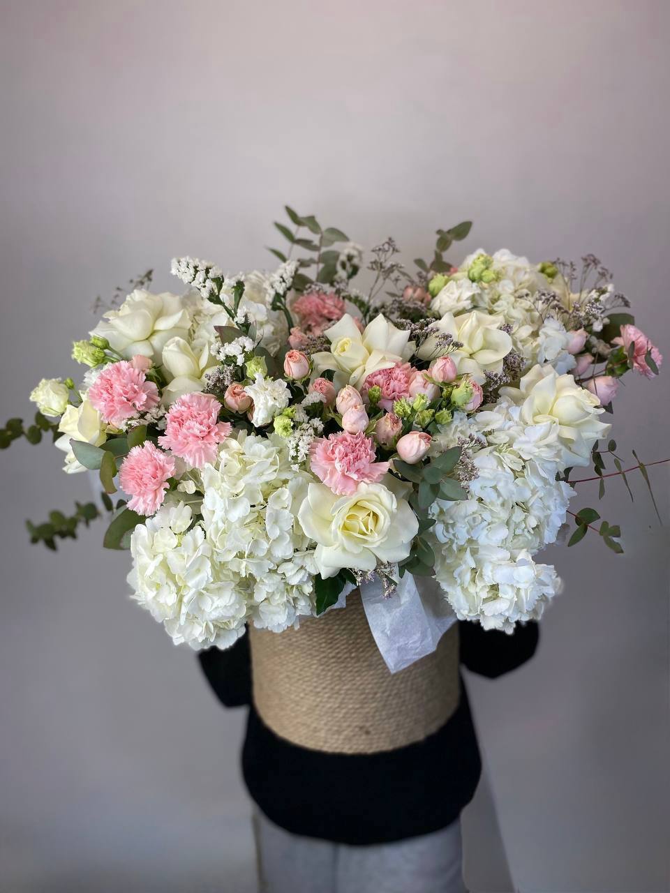 розовые розы, пионовидные кустовые, эустома, ранункулюс (возможна замена в зависимости от сезонности) в джутовом кашпо с элементами бус и перьев.