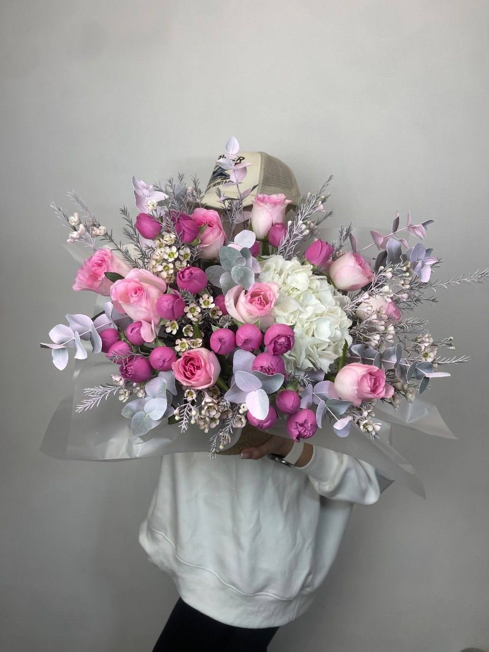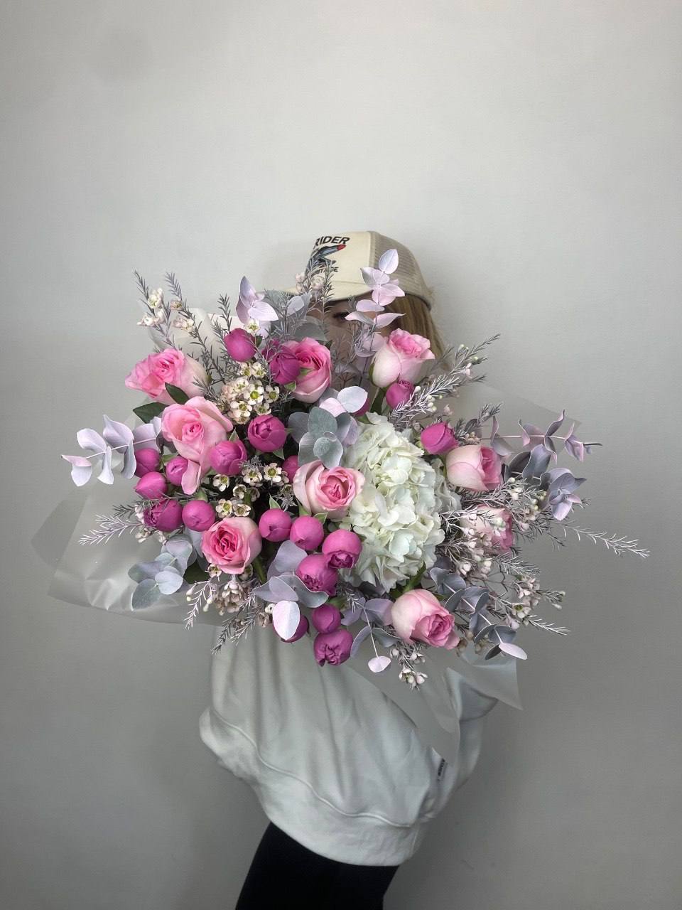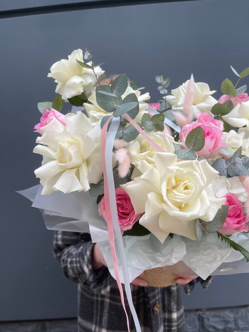 пионовидные розы Мисти Бабблс, джутовое кашпо, стифа, эвкалипт.