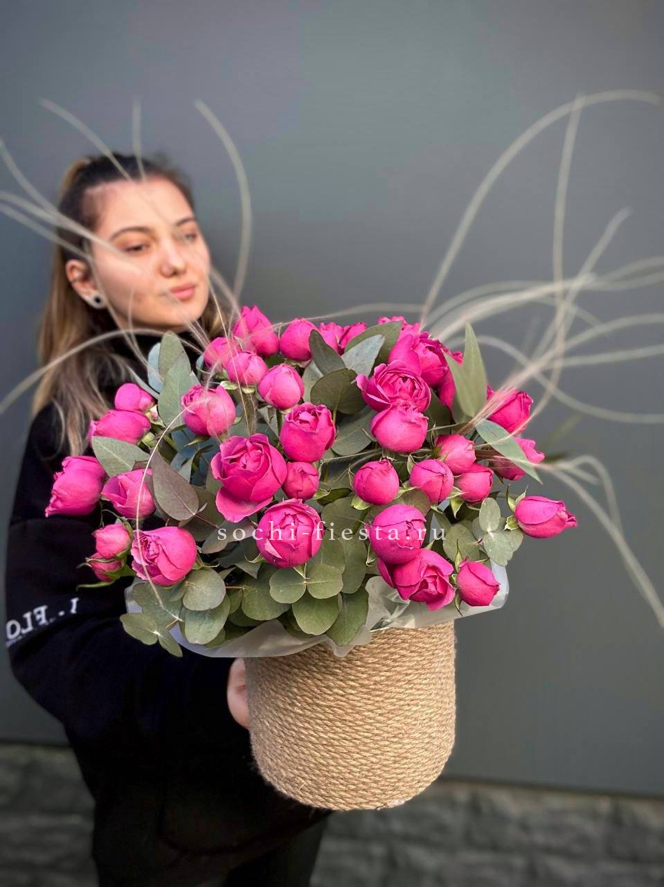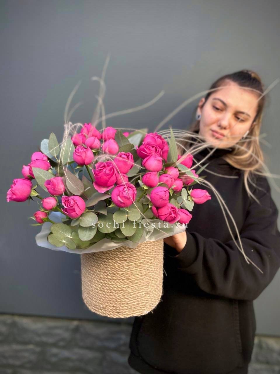 Пионовидные розы в джутовом кашпо
