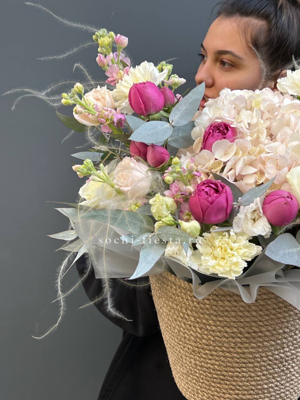 Пионовидные розы в джутовом кашпо