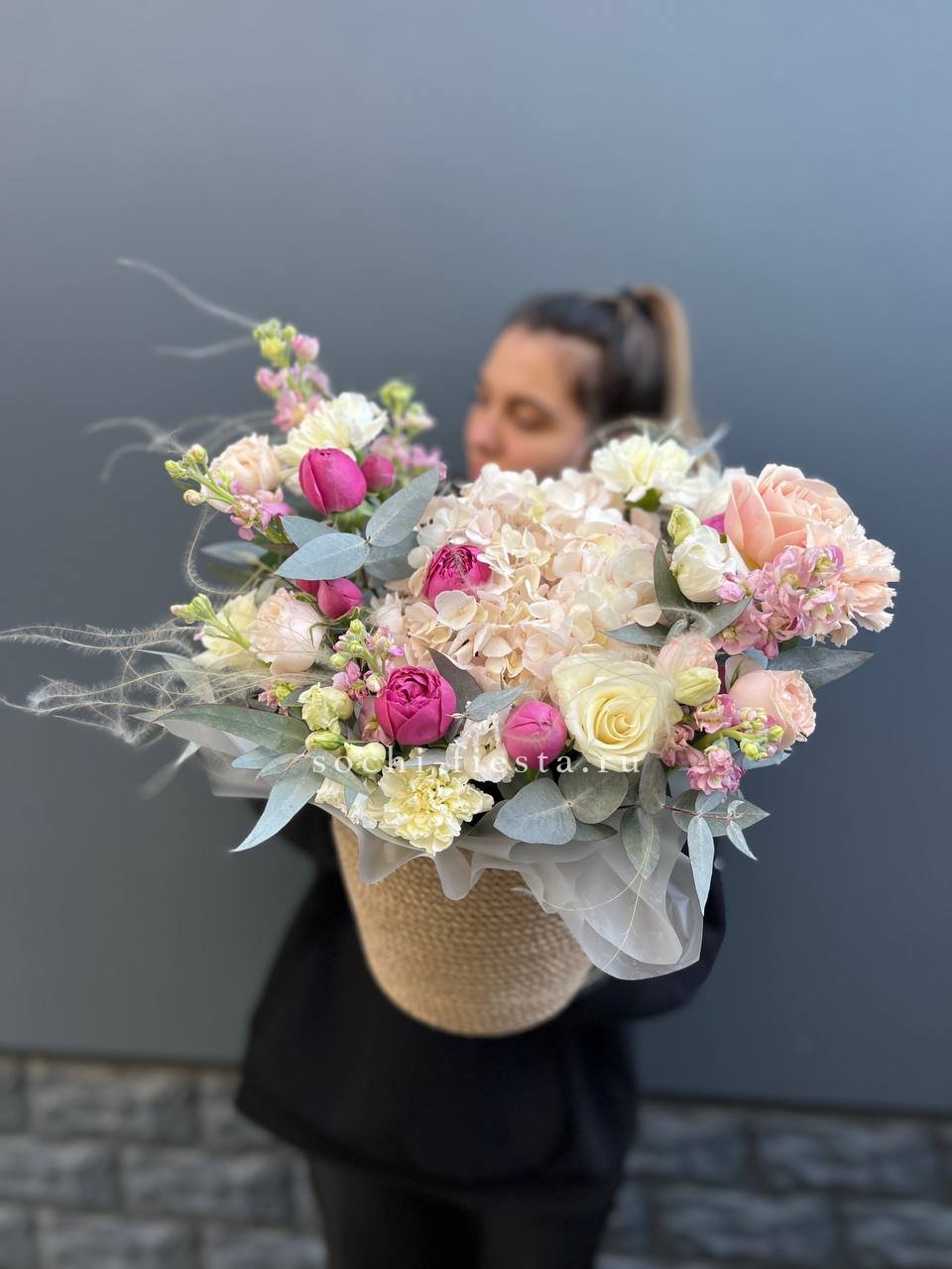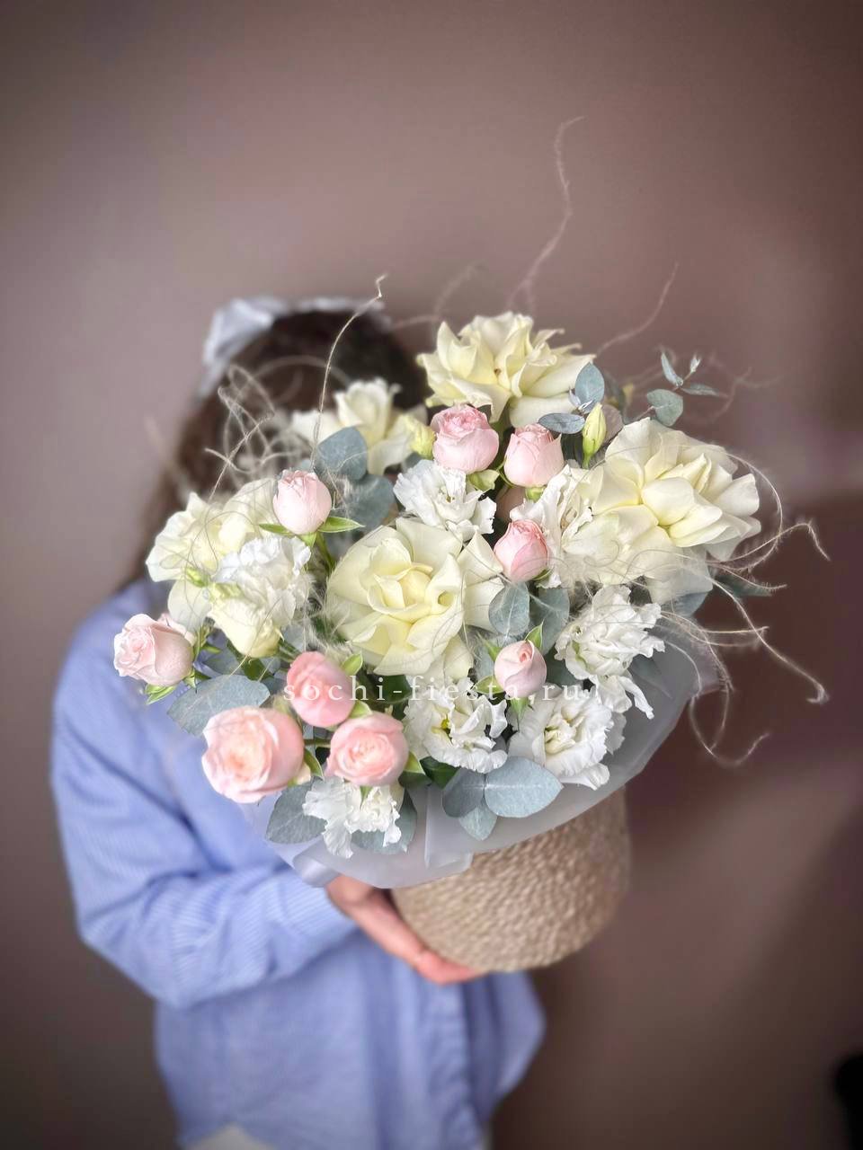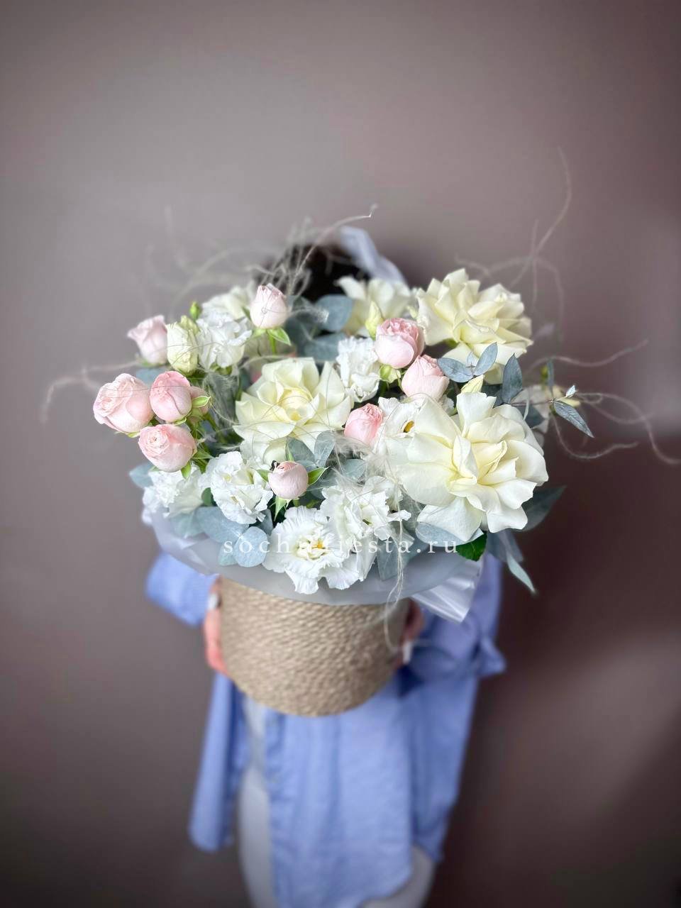 пионовидные розы Мисти Бабблс (25 веточек), джутовое кашпо, стифа, эвкалипт.