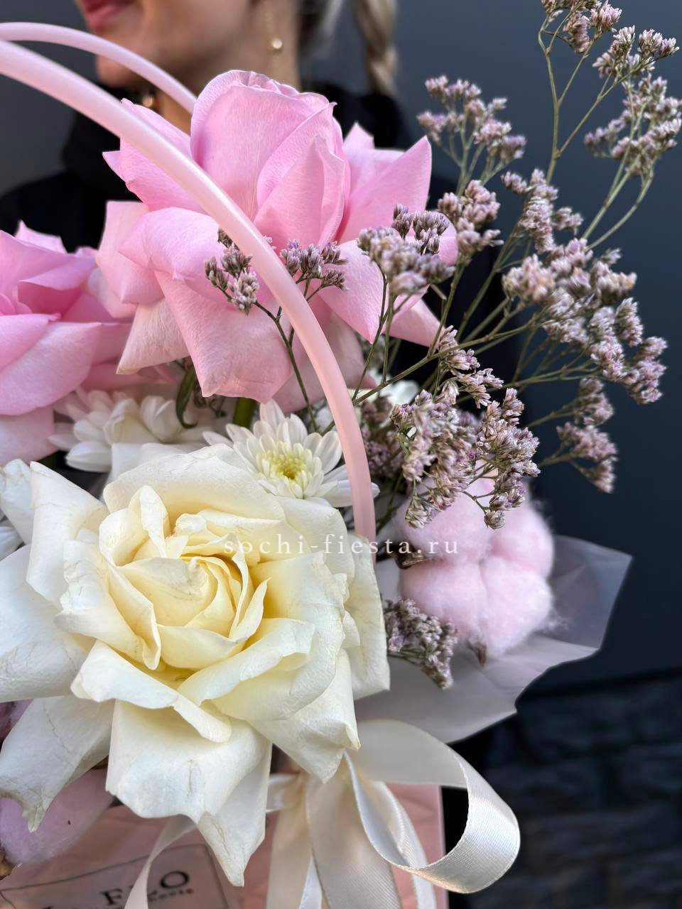 герберы, диантусы, альстромерии,  лента, эвкалипт,  сумка-кашпо.