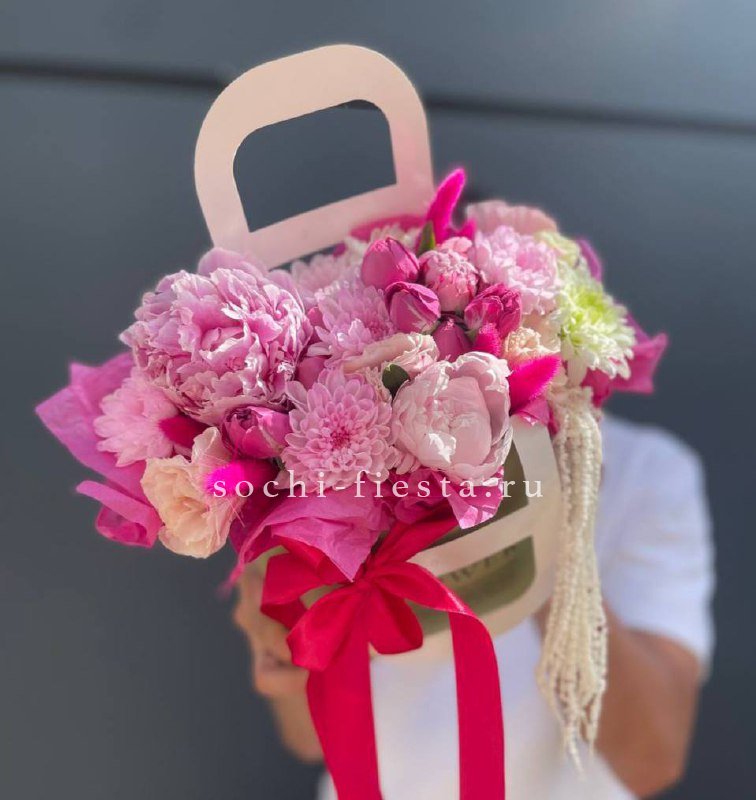 Пионы раскрываются среди кустовых роз и хризантем, а лагурус добавляет мягкие текстурные акценты. Сумка-кашпо с лентой удерживает форму и позволяет композиции сохранять объем. Сезонное сочетание с природной гармонией.